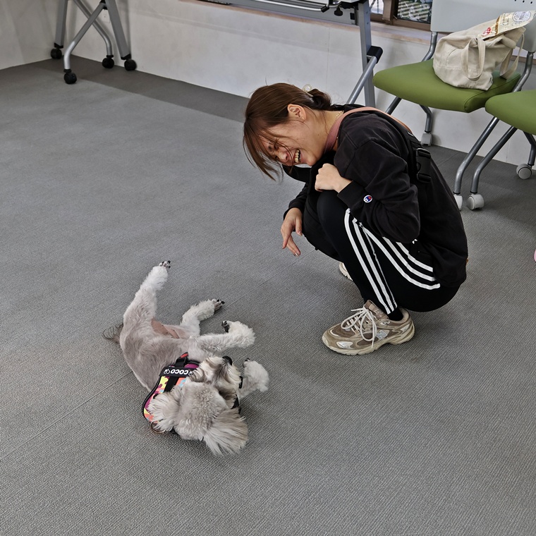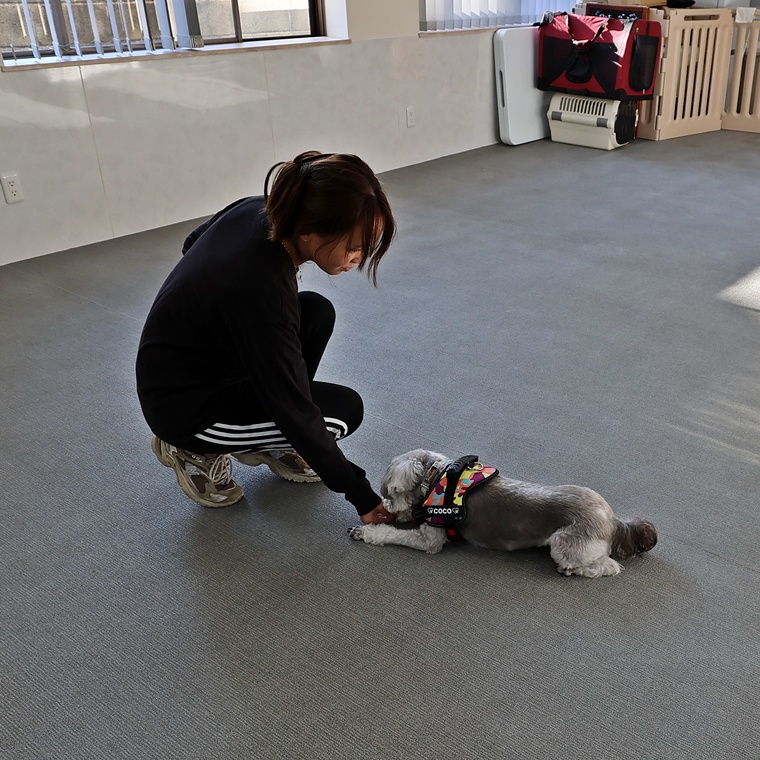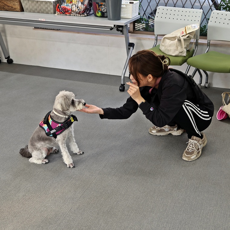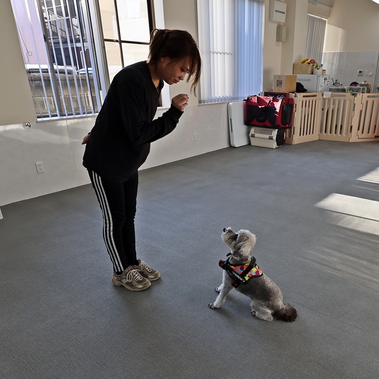トリックではなくコマンドとして「アテンションコマンド」「お座り」「伏せ」を基本的な方法でcocoちゃんにトレーニングをすると、今までの飛びつきてトリーツを食べていた習慣が無くなり、飼い主さんへアイコンタクトを向けられるようになり、お座りの姿勢も持続するようになります。