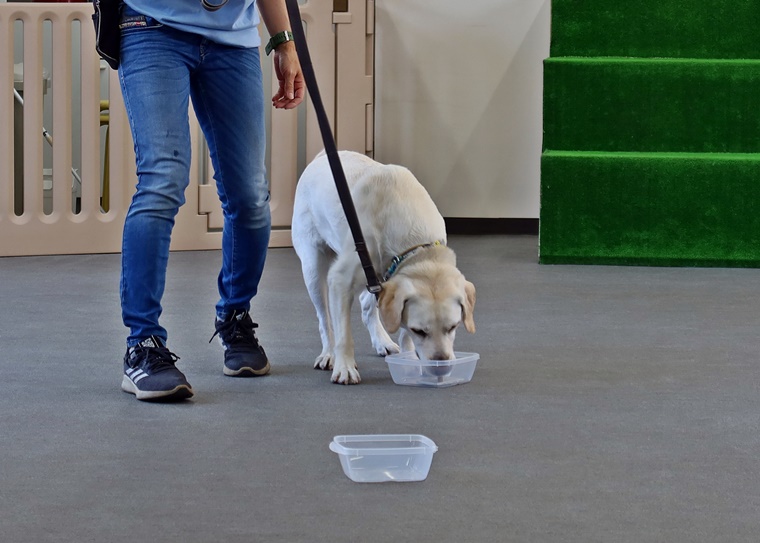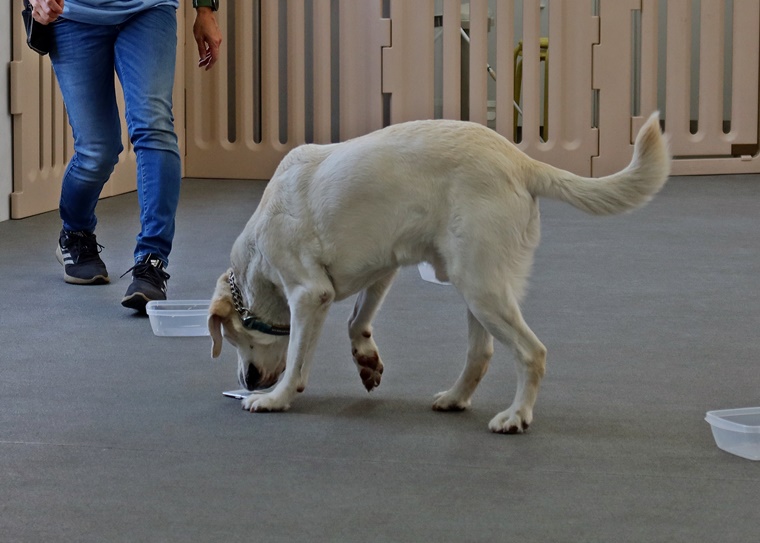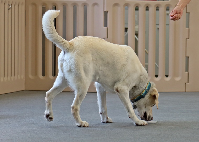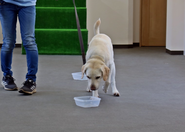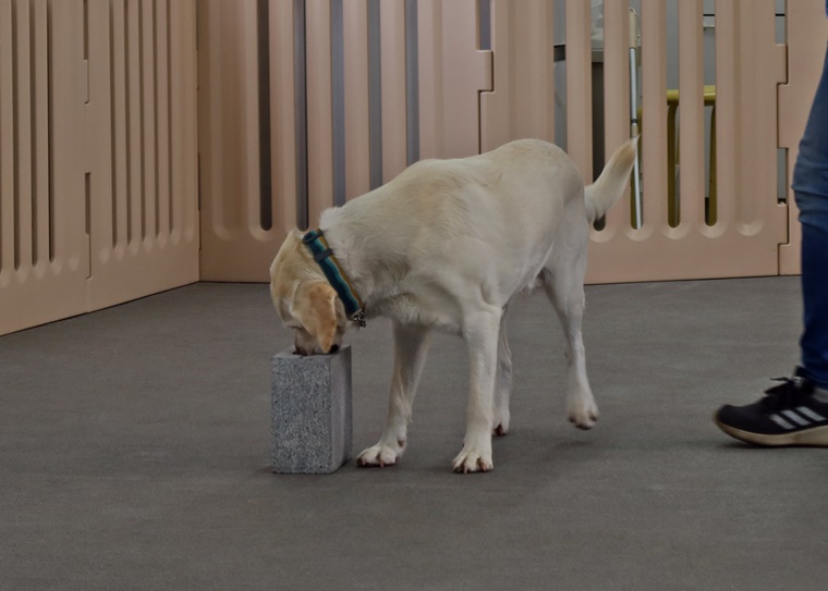 今日は急激に気温が高くなった事もありインドアのみでのセッションとなりましたが、エアコンが稼働する事でセントコーンを捉えるのには少し難易度が上がる場面も見られました。ビギナークラスの2頭は、ペアリングからのステップアップで一定の告知動作の認識まで進めることが出来ました。改めてビギナークラスでのステップアップの方法を、ハンドラー側の立場とトレーナー側の立場で再確認できたことは、良いセッションになりました。