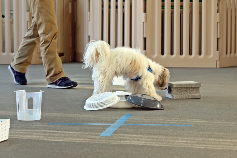 リサちゃんは、BOXへの躊躇はありませんが、トレーナーの動きに対しての反応が強く、フードBOXに対してのアクセスに影響が出ていました。2回目以降のセッションでは、トレーナーが動かずにBOXへのアクセスに集中ができるように設定を変更して、後半は確実にフードBOXからのセントコーンへの反応とアクセスができていました。Step3までのバリエーションは最初のセッションでクリアできていましたので今後も楽しみです。