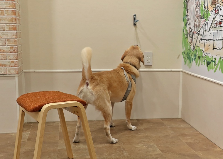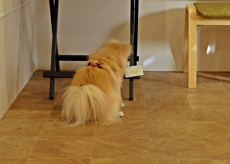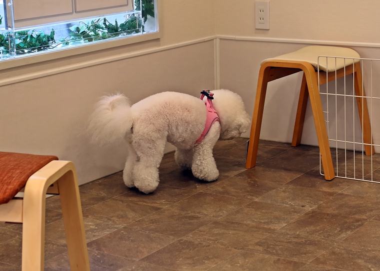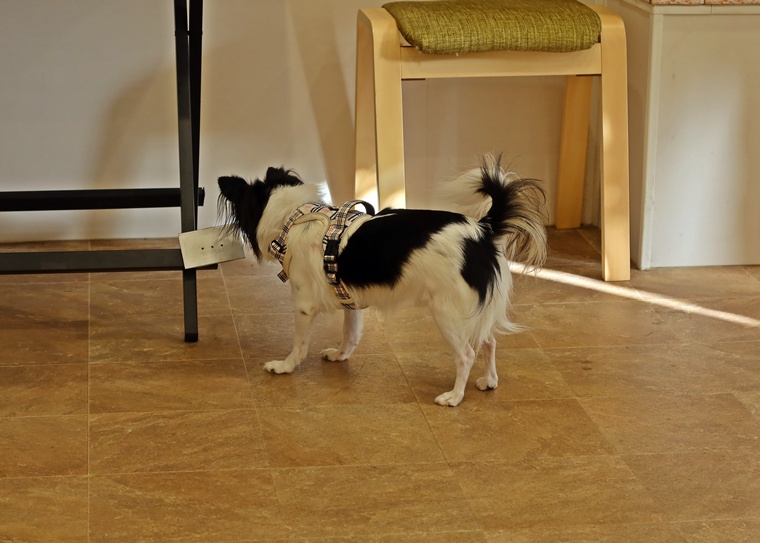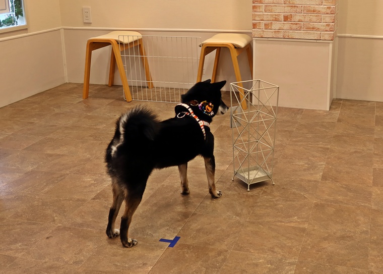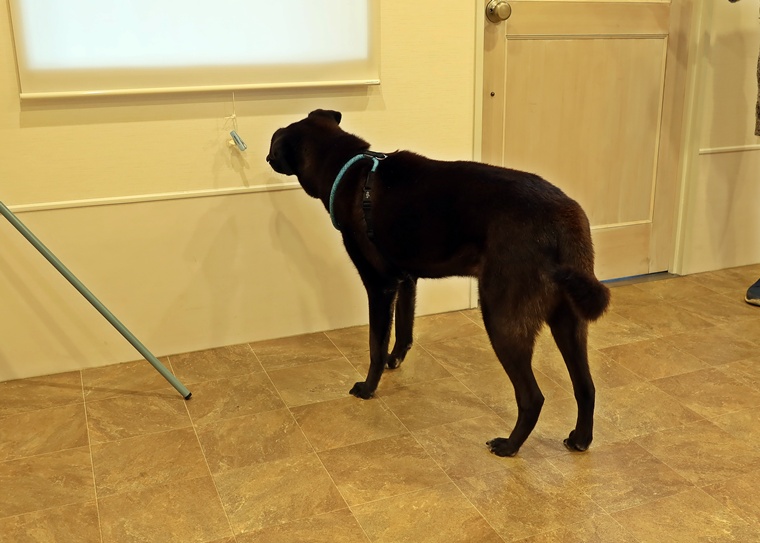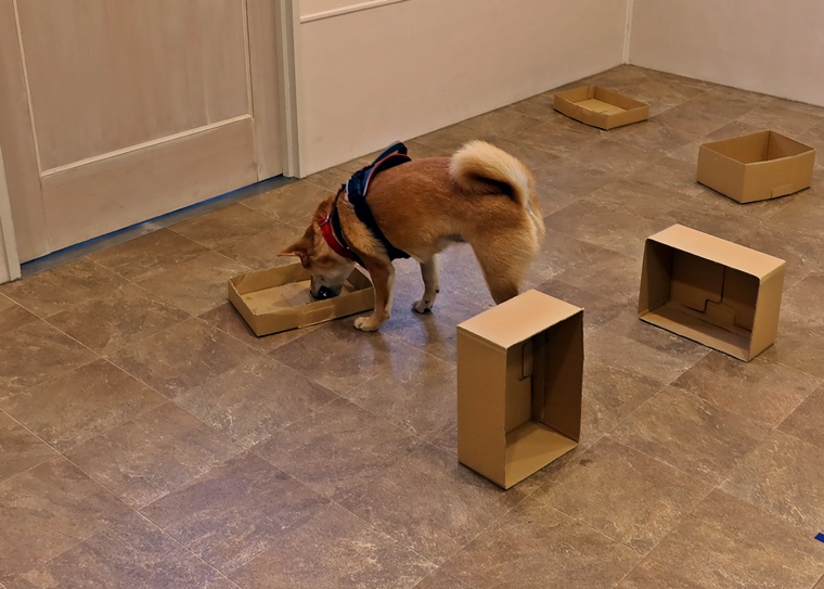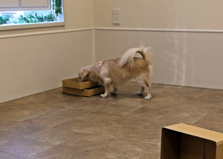 セッション中に苦手な音が何度か聞こえましたが、めげることなく捜索を継続できていました。苦手な掃除機にも近づいて捜索できていましたので、ノーズワークを通して自信をつけさせられるようにしていきましょう。少し躊躇する気持ちが出てしまうと、告知の際のハイドとの距離も開いてしまいますので、告知姿勢は、相変わらず安定しています。