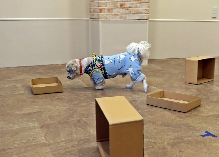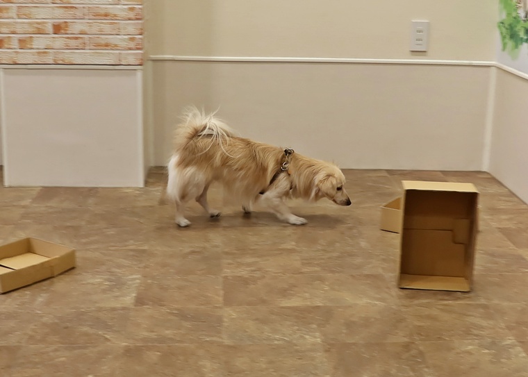 前回のセッションでも、意欲的なノーズワークが出来ていましたので、今回もステップアップとして複数のフードBOXのサーチとハイバリュートリーツの大きさを小さくして難易度を高めました。またバリエーションBOXは最終StepのOut of BOXもクリアできていました。少しサーチ時間が長くなる事で集中力の持続時間も延びていますので、今後も期待しています。