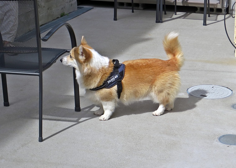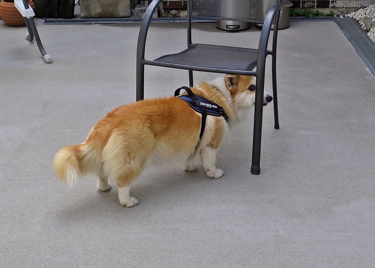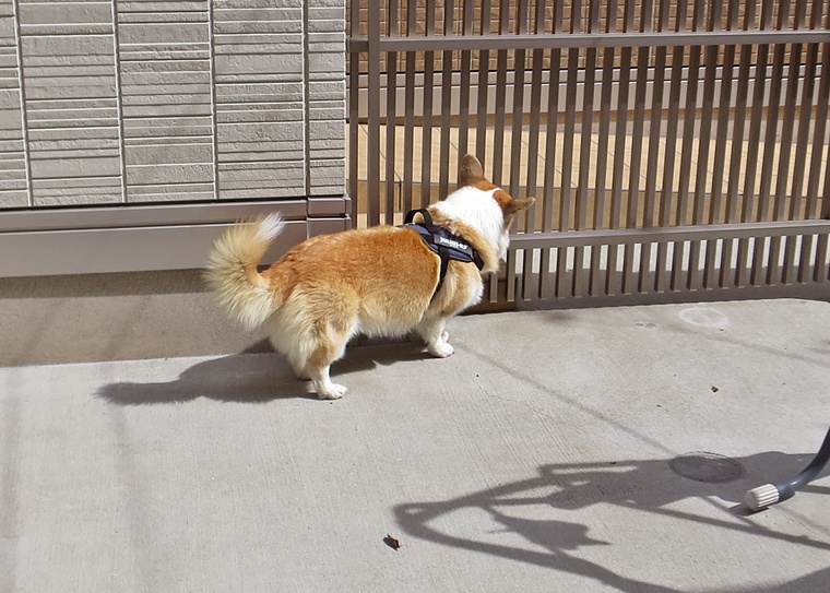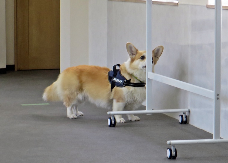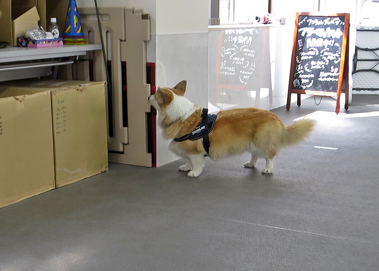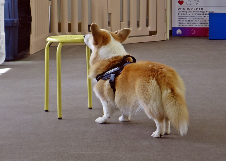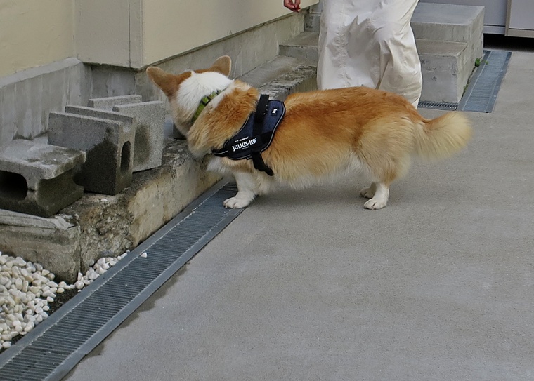 ディストラクションの誘惑臭を無視できていましたし、捜索作業の意識は安定しています。告知の際の目配りやハンドラーへの意識の改善と設定位置によりスクラッチ行動の反応は改善が必要です。屋外の風の流れが、捜索に影響をあたえ、捜索時間が延びるセッションもありましたが、良く探すことができていました。