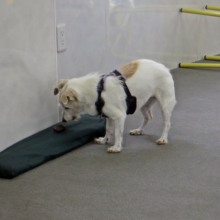 今日も驚かされるノーズワークを見せてくれたラニちゃん。スタートからの意欲は相変わらずですが、すぐにセントコーンを捉える為に、勢いだけではなく冷静な捜索のためのリズムに入ることができています。前半は、設定難易度を高くしませんでしたので、非常に速い捜索でしたので、少し難易度を高めると3分を越える捜索も見せてくれました。16歳という年齢を考えると、ここまで集中する時間は長くありませんのでラニちゃんのポテンシャルの高さが分かります。とはいえ、長くなった捜索後は、休憩を充分にとり最後のセッションは楽しくアッという間に捜索が終わりました。また楽しみましょう。