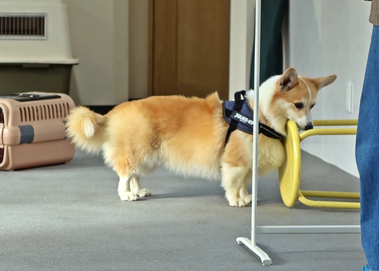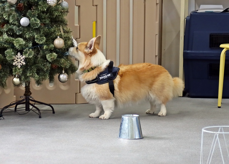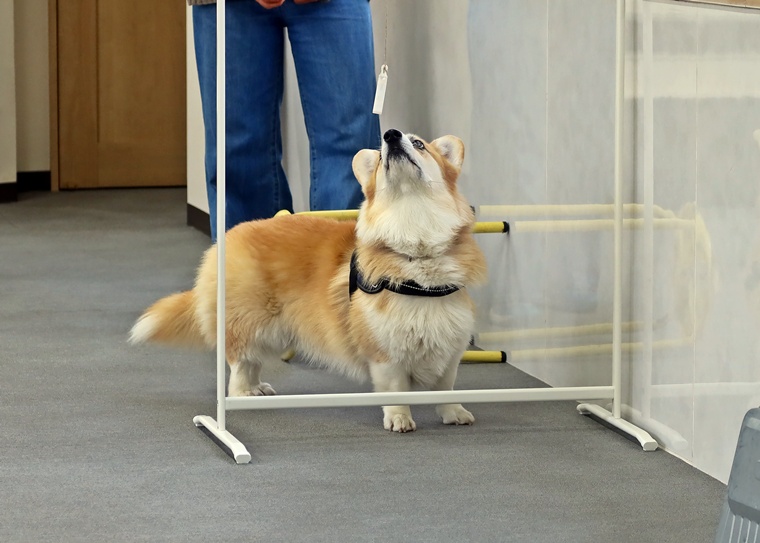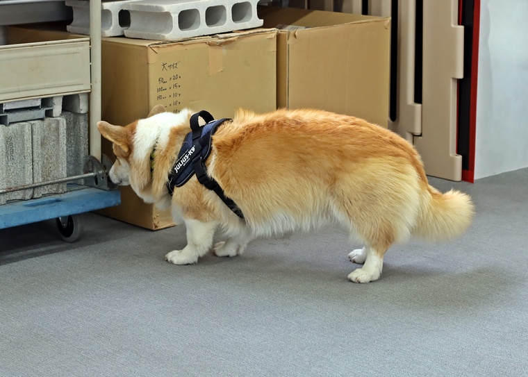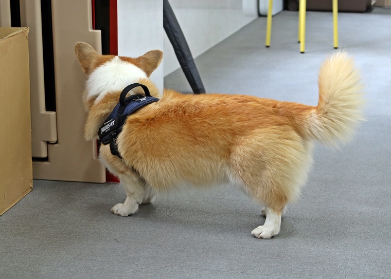 本来は、アウトドアサーチへのステップの段階ですが、チャレンジハイの高さの経験がありませんでしたので、今日のセッションでは、インドアでの初めての設定を経験して頂きました。短時間で到達できましたが自信が無く静止姿勢の維持ができませんでしたので、時間をかけてパコ君が告知に自信が持てるように進めました。最終的には、告知も安定していましたので、嗅覚能力の高さを今後も引き出しながら様々なシチュエーションを経験させていきましょう。その他の設定に関しては、終始安定した素早い捜索と的確な告知姿勢が見られました。