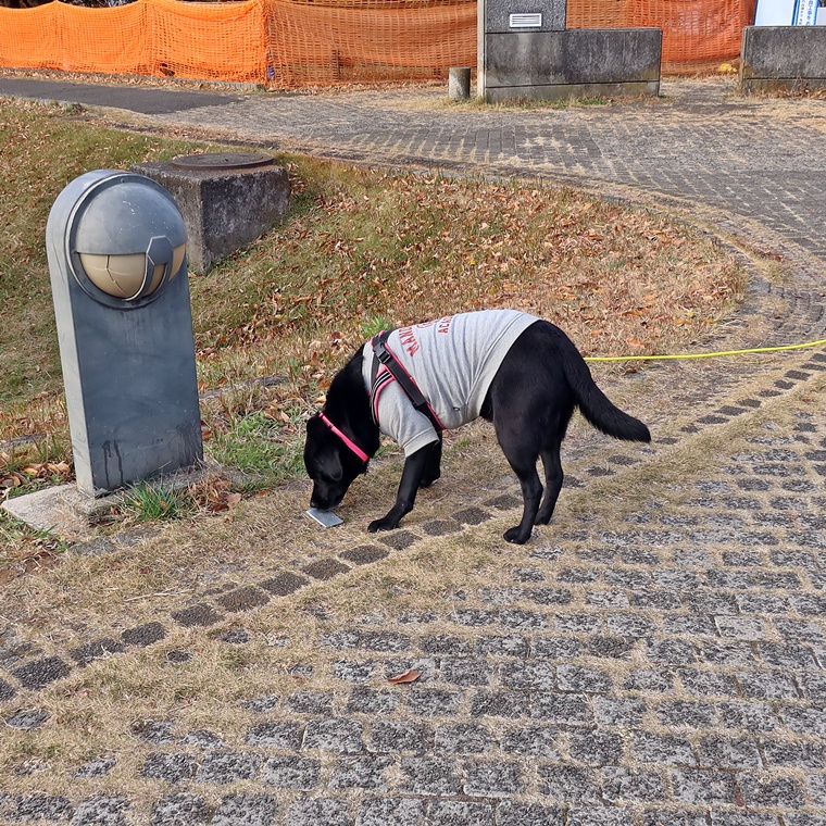 前回よりも、「Search」のコマンドで作業をスタートする意識と意欲は出てきているようです。前半のセッションは、誘惑刺激が少ない環境下でしたので、ピッキーちゃんの嗅覚能力を100%引き出した捜索が出来ていました。後半は、捜索エリアの中に誘惑刺激の多い場所が含まれることで、集中が出来ずに、誘惑刺激に大きな影響を受けることとなりました。現時点でのピッキーちゃんの動きや反応を読み取る事にハンドラーが自信を持てていませんので、本当に探しているのか?誘惑に影響をされているのか?の判断が出来ていないようです。この点を明確に読み取れるように誘惑に負けないハイドへの意欲の強化トレーニングを最後にリカバリートレーニングとして行いました。また、告知の静止姿勢の維持や、ハンドリングの際のリードの捌き方など、ハンドラースキルの向上を引き続き取り組んでいきましょう。