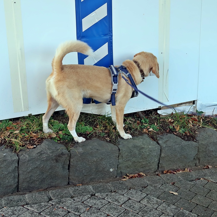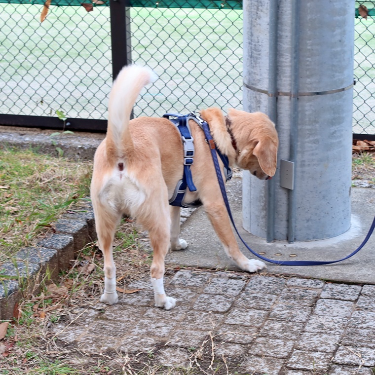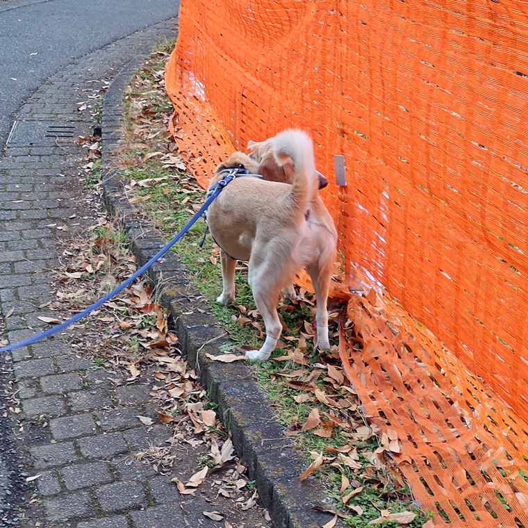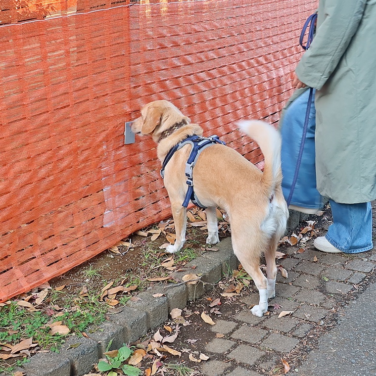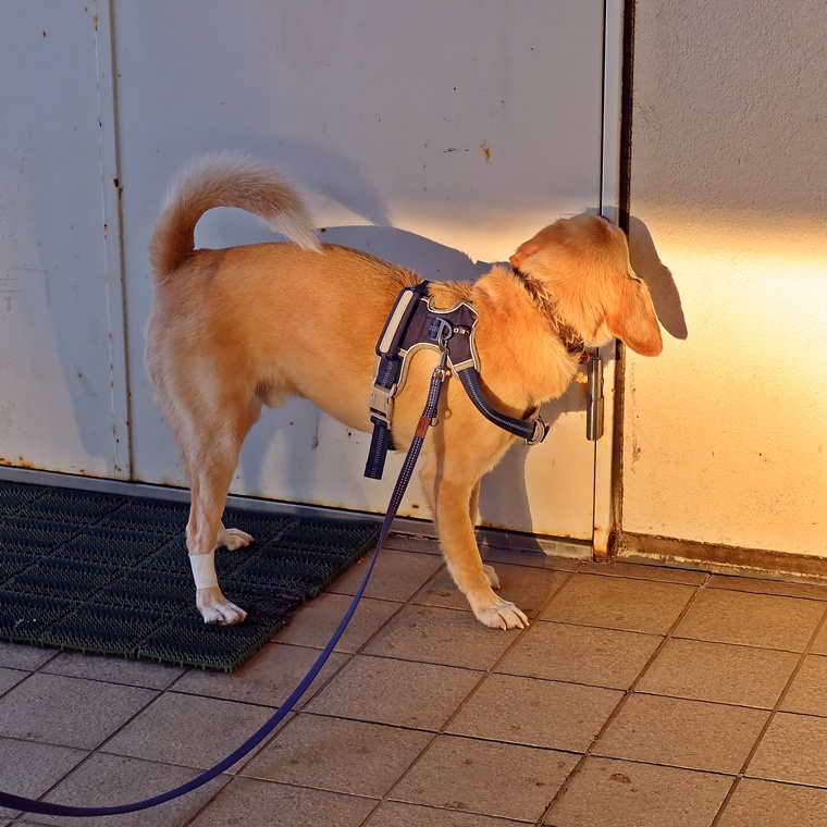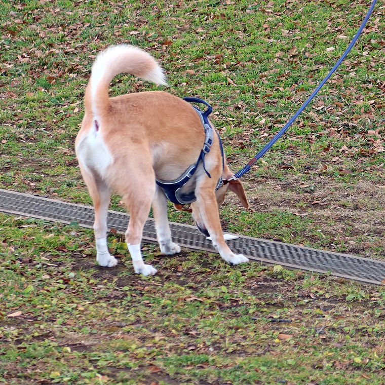 現時点でのコール君のアウトドアサーチは、誘惑臭に対しての反応の方が強くなり、捜索としての作業への切り替えができない場面が多くなっています。そこで今回は、短い距離・狭いエリアの中に、匂いの大きさを最大限にしたハイドと、モチベーターレベルも高めた設定で、環境設定をステップアップしながら課題の克服に取り組みました。今回のンセッションでは、環境のディストラクションに負けずに捜索作業に切り替えられるようにする事が目的でしたので、告知姿勢よりもハイドへの到達を第一目的としました。ハンドラーのリードの捌き方やリードの延ばし方なども自信を持って対応できるように、これからも楽しんでいきましょう。