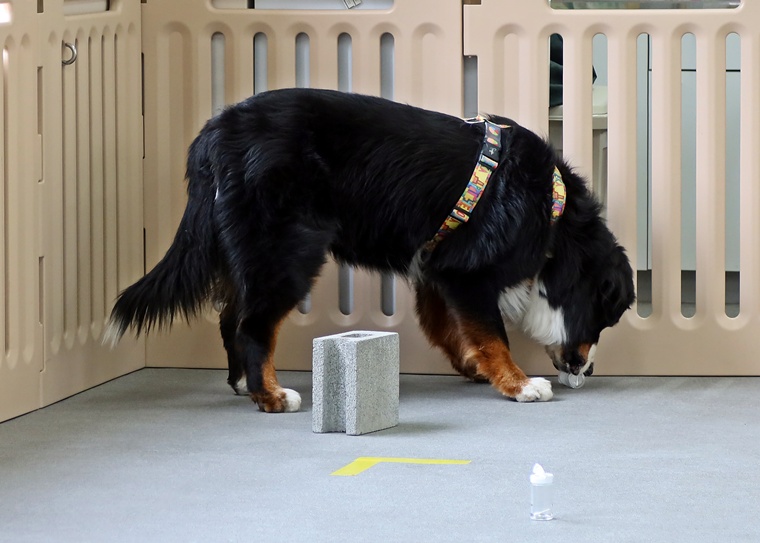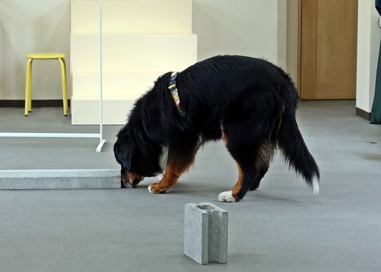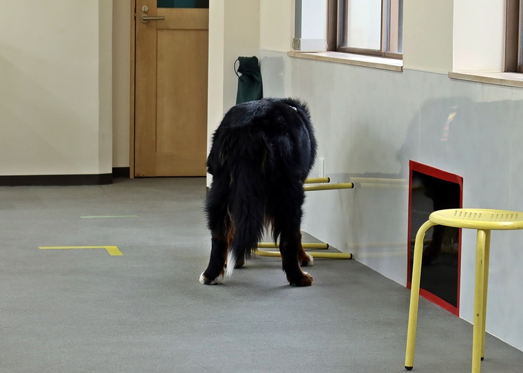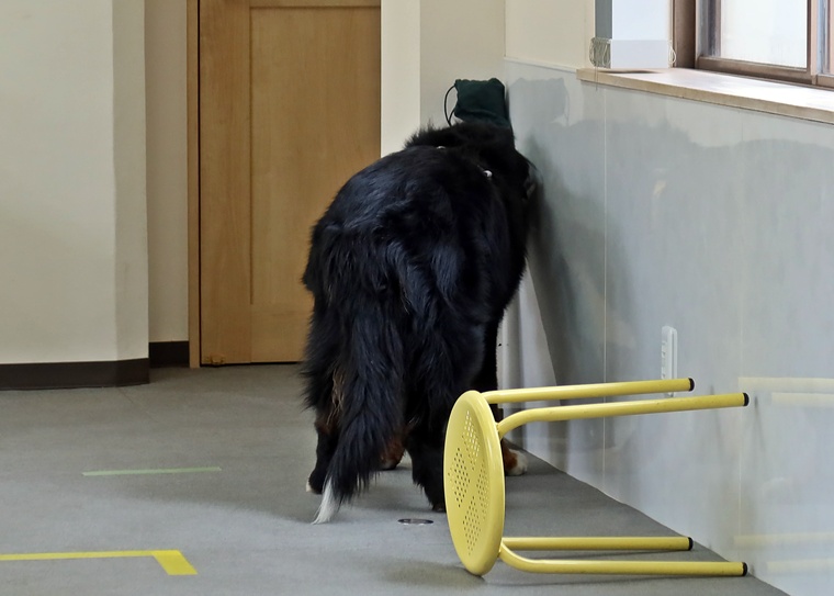 今日のレッスンの設定難易度は、ハンドラー側の視点からのディストラクションとブルーノ君の告知の精度。またハイドの高さを以前行ったチャレンジハイの設定での告知の精度の確認などを行いました。前回のセッションで告知の静止姿勢の維持が先読み行動につながっていましたので報酬の提示方法を変えたことにより、今回は改善も見られ、静止姿勢のいじができるようになってました。小さなハイドからのセントコーンが、エアコンの風量に流される事でオブジェクトに微妙なセントプールを生成するために反応が見られるセッションがりましたが、これも含めてハンドラーはブルーノ君の告知までの動きを把握する必要があります。