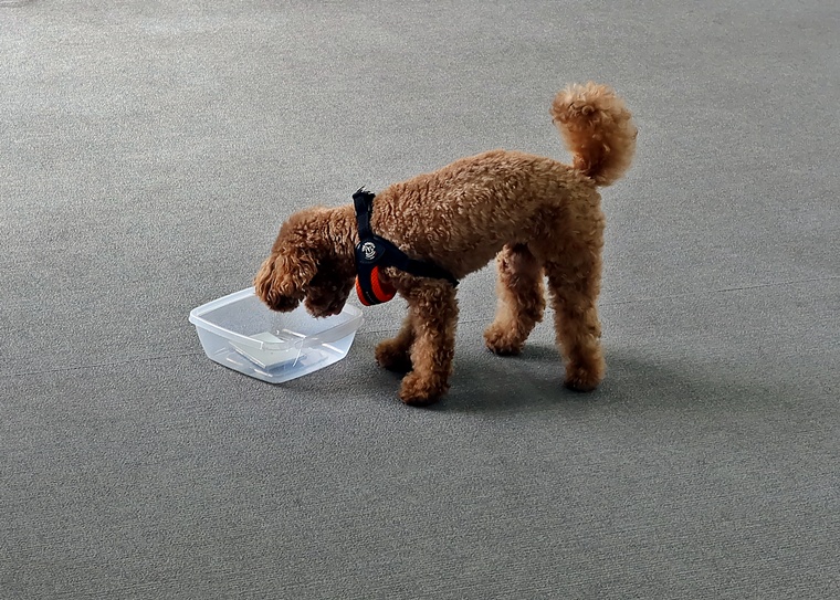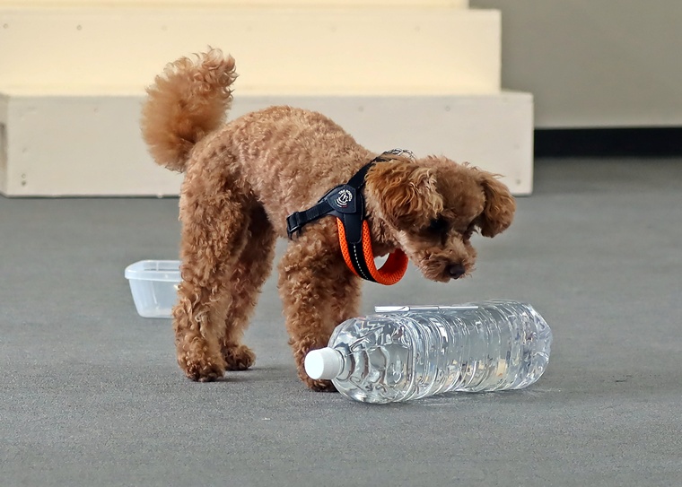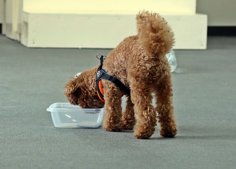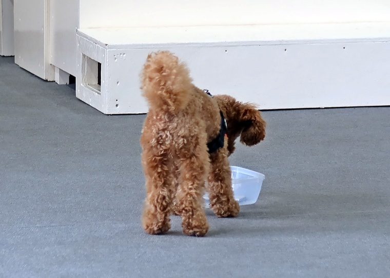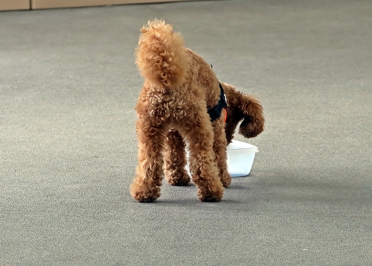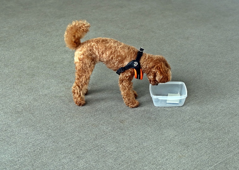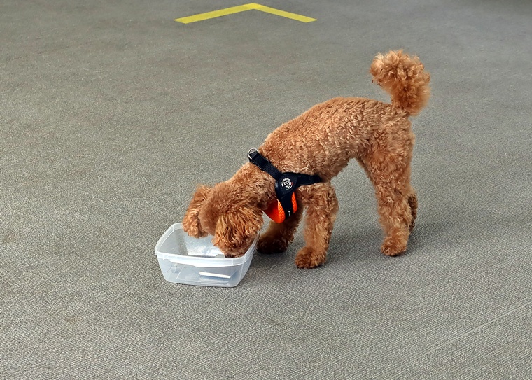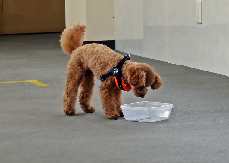 前回のペアリングから期間が空きましたが、ハイドへの認識がありましたので、セントプールの設定で告知姿勢の理解を深めながら、ステップアップを行いました。後半は、飼い主さんがハンドラーとして報酬の提示ができるようになっていましたので、今後も楽しみです。また、設定難易度は、少し高さのあるセントコーンの設定までをクリアできていますので、スクラッチやハンドラーへの依存に関しては、今日のセッションをベースとして意欲的で自立性の高い捜索ができるように進めていきましょう。