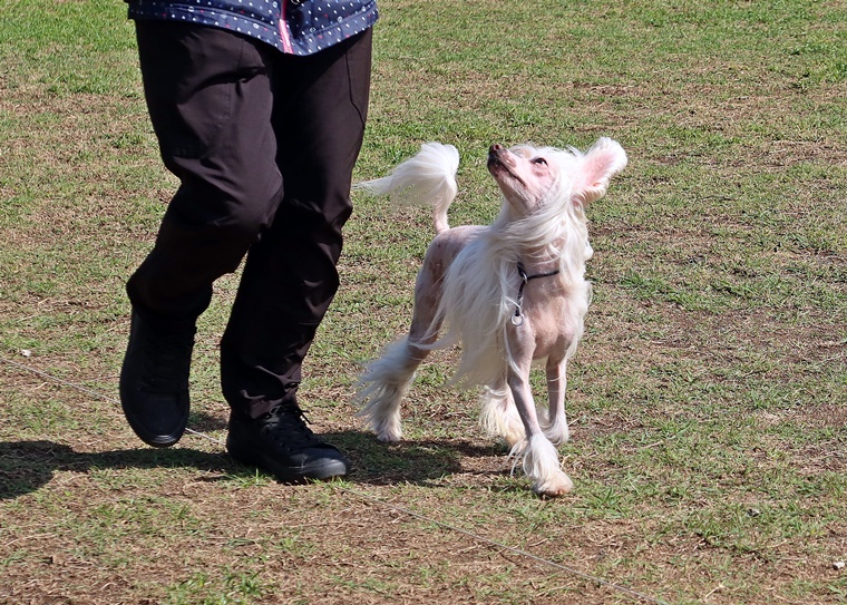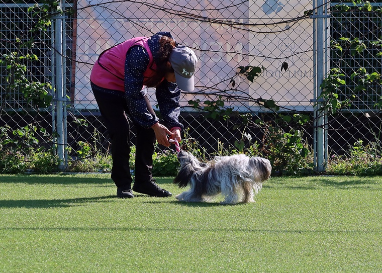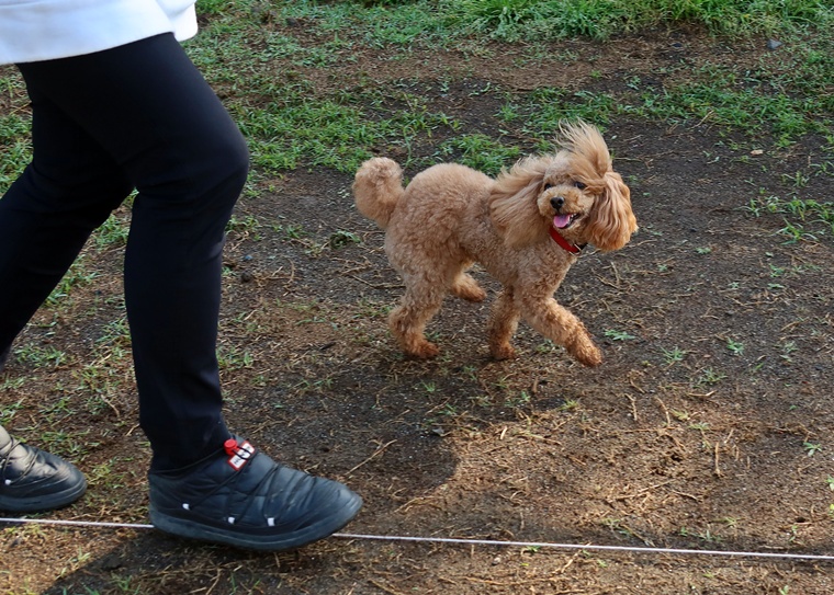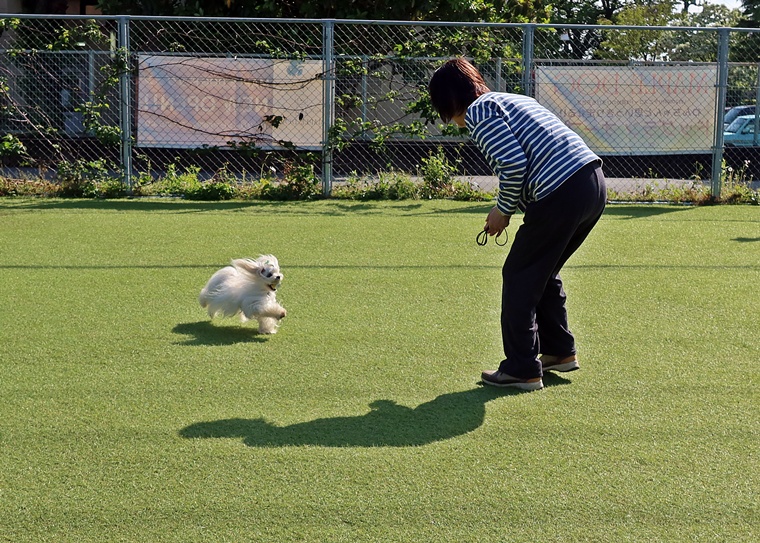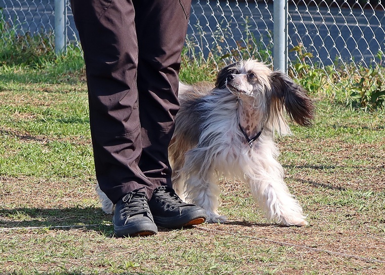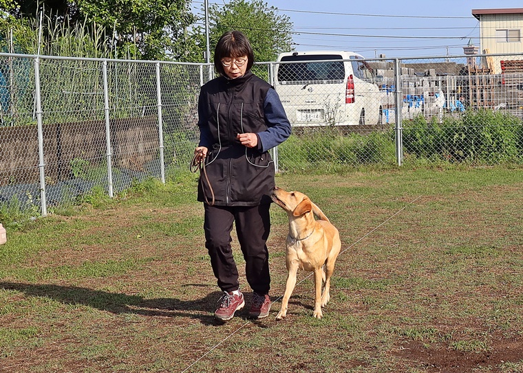 周りの環境音による意欲の低下など、様々な苦手要素がある中でも、指導手のコマンドが優先されるように良い機会と捉えながら進めていきましょう。右屈折の膨らみとターン・課目終了時の脚側停座は、今まで通り一貫した対応で、トナ君の気付きを引き出せるようにしていきましょう。この気付きを引き出すポイントも、今日のようなタイミングでは、うまく伝わらない事もあります。またターンと脚側停座では、指導手へのアイコンタクトの維持が必要です。回り込みながら、周囲へ意識が向くことで大回りになり易くなります。また自由選択課目もバリエーションを増やすことと、行進中の伏臥を声符のみで実行するためのトレーニングを進めていきましょう。