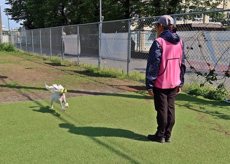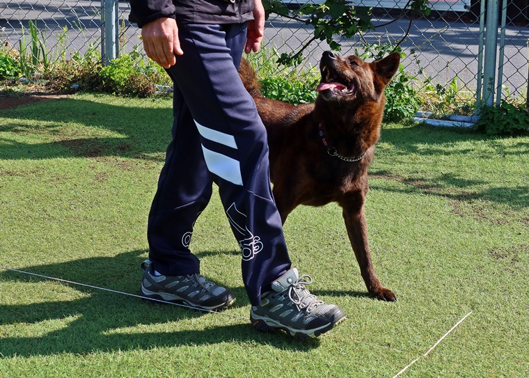 意欲と集中力は維持させつつ、課題である脚側行進の先行や被り傾向にある動きの修正を行い、頭1つ分後方でポジションの維持ができるようにトレーニングを行いました。このポジションを一貫してトレーニングをする事で行進中のダ行の規定ラインでのコマンドの実行も可能になります。