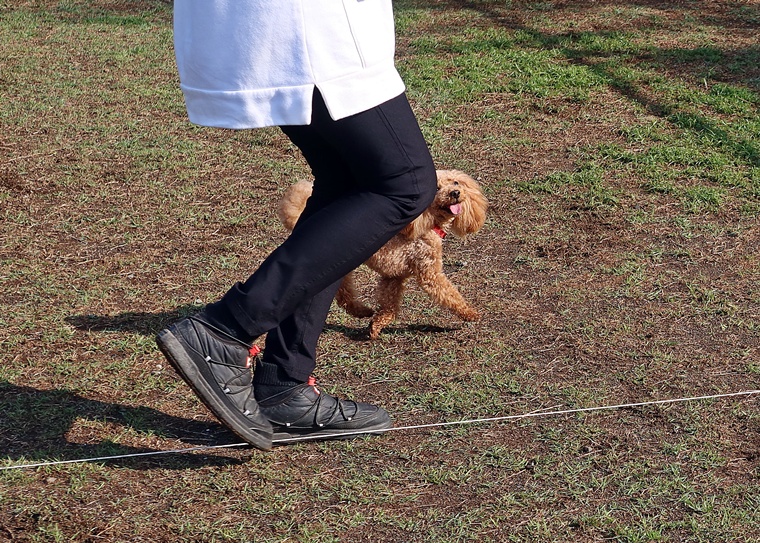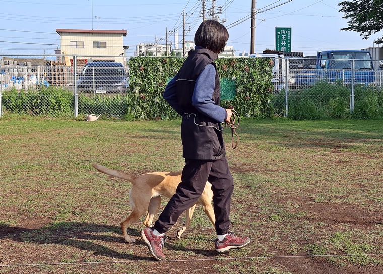 脚側行進の強化を行い、特に速歩の姿勢の強化を進めていきましょう。行進中の作業においては、常歩・速歩共に、脚側行進のレティちゃんの集中が結果につながりますので、紐なし脚側行進の精度の向上は重要なトレーニングになります。速歩行進中の停座も、課目の理解を進めながら、速歩での脚側行進の意識に向け方に注意しましょう。