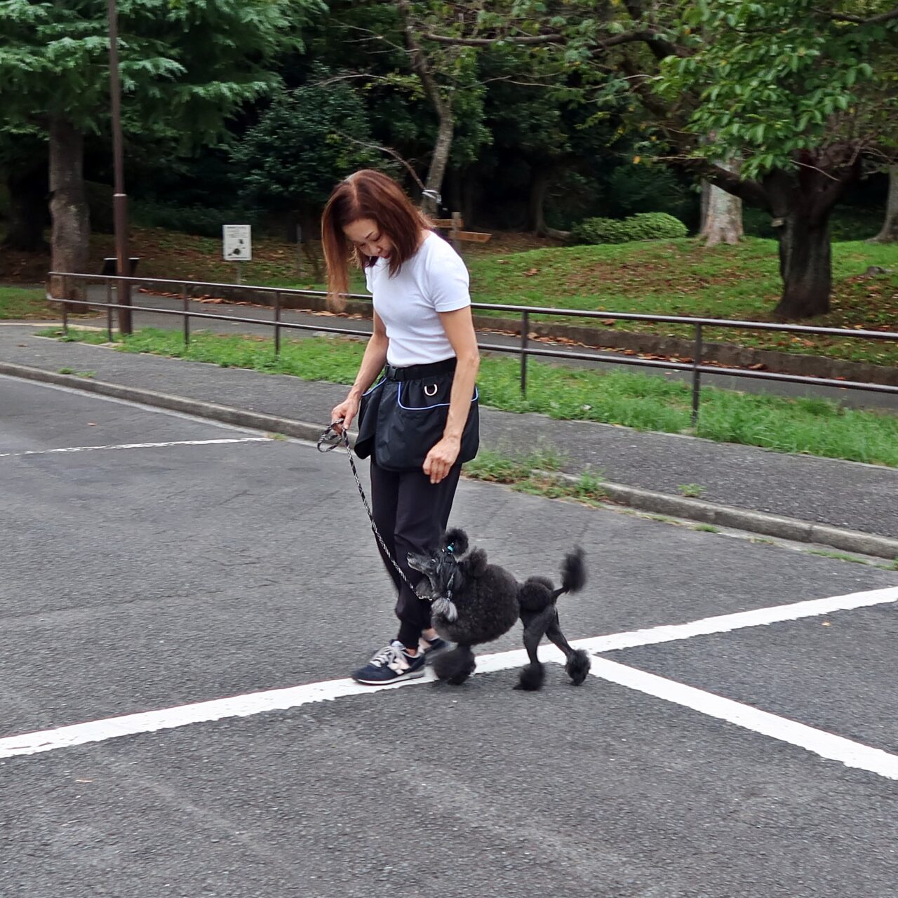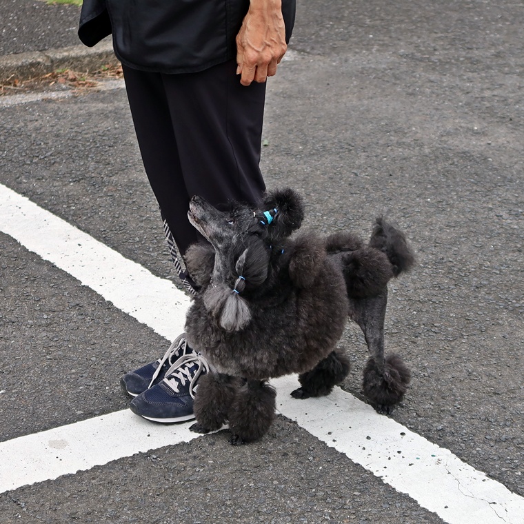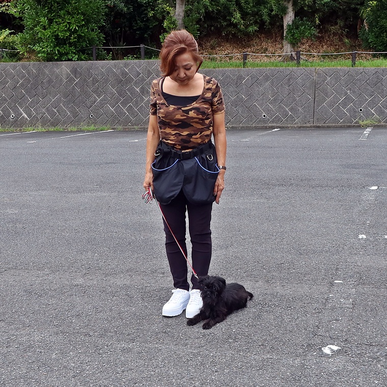 「Heel」での脚側停座が、どこでも出来るようにしていく必要があります。その際の飼い主さんへのアイコンタクトを持続できるようにシッカリ誉める事を忘れないようにしてください。トリーツだけを与える事を急ぐあまり、左手は、常にエプロンのポケットに入っていますので、基本姿勢の意識を忘れずに、まずは誉めることを最優先してください。