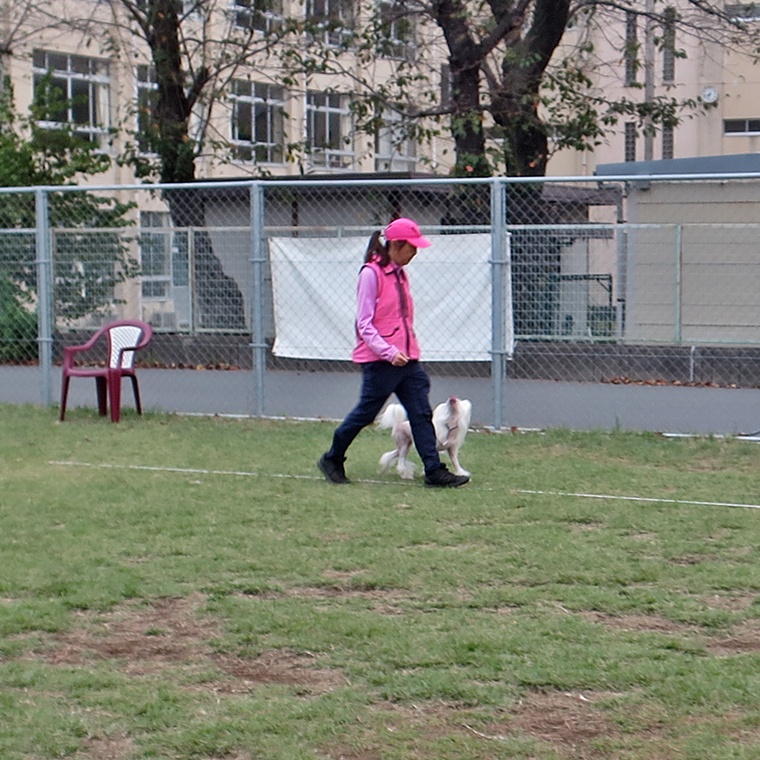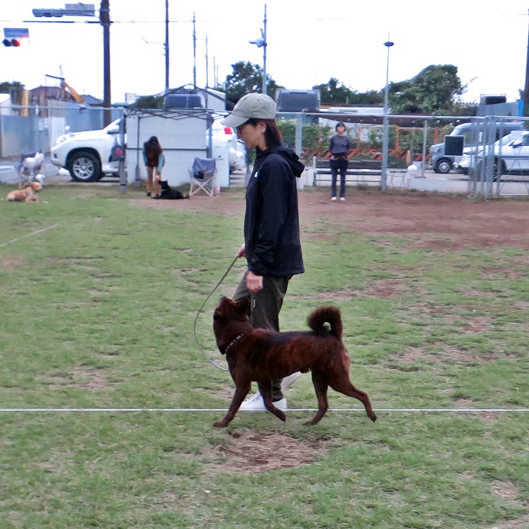 意欲の高さから脚側行進の先行する癖は、短時間には改善されませんが現在の指導手とカノアちゃんの関係の中では、指導手のエネルギーをカノアちゃんが上回っていますので、実質的なリーダーシップは、一貫した姿勢で築き上げるようにしましょう。待機の休止に関しても、指導手の観察力が上回らない限り指示された場所に留まり集中する事は出来ません。脚側行進の意欲をシッカリ引き出しつつも、指導手の顔の位置を左に振り過ぎなように脚側停座までを作り上げていきましょう。伏臥の実行速度と立止の後肢の始動に関しては、レッスンで行った方法を取り入れてみて下さい。行進中の伏臥の際も、ジリジリと動いてしまう傾向は、レッスンまでの休止の安定性と同じですので課目の動きだけにフォーカスせずに1つ1つのコマンドへの理解を深めて下さい。