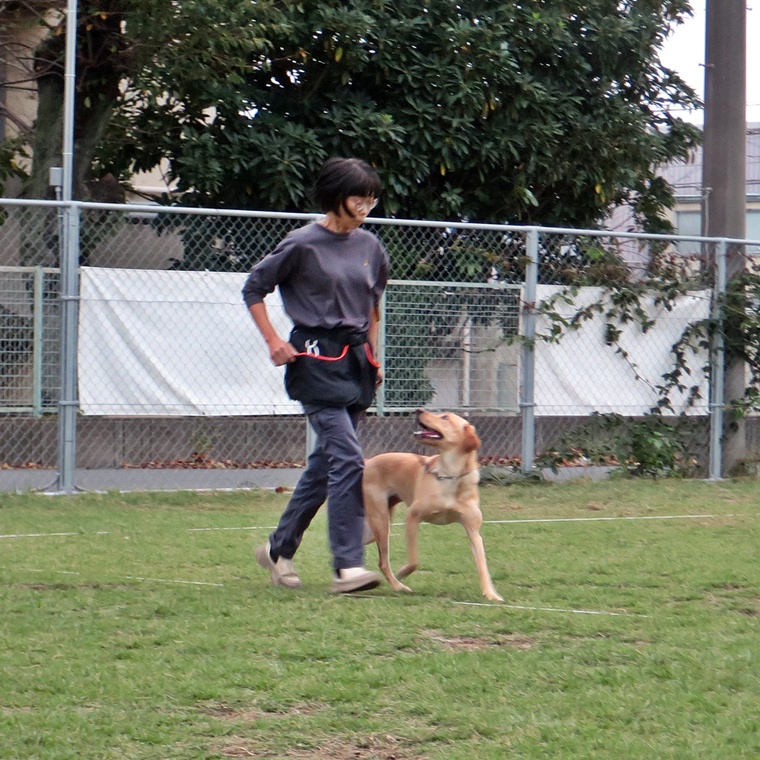 現在の報酬を手にして脚側行進をする際の常歩では、手の中のトリーツを奪おうとする動きが常時見られます。速歩になると指導手の手が上に上がりますので、その行動は見られませんが、現時点のトレーニングでは、指導手の手に対する接触をせずに脚側行進の姿勢の維持ができるようにして下さい。匂い嗅ぎへの意識が強い事や脚側停座のポジションが定まっていない為に、課目終了時の脚側停座・伏臥や立止の際の脚側停座がバラバラになっています。どこでも正しいポジションに停座ができるようにトレーニングをして下さい。また、コマンドが出ている際に、姿勢を維持して、よそ見や匂い嗅ぎをしない基本的な理解を日頃の生活やお散歩の中から作り上げるようにして下さい。