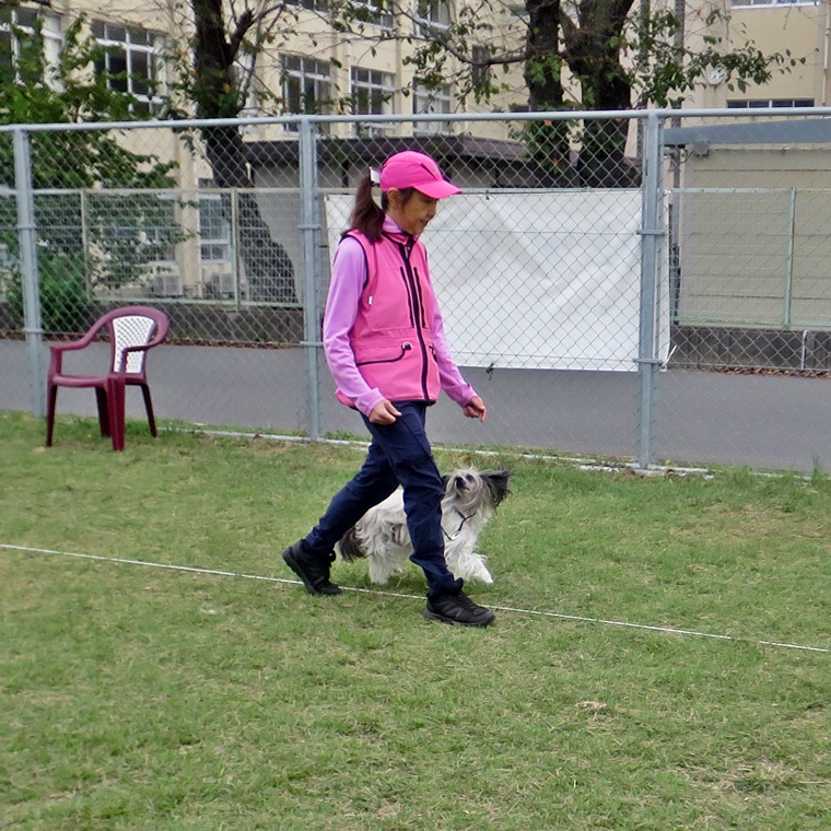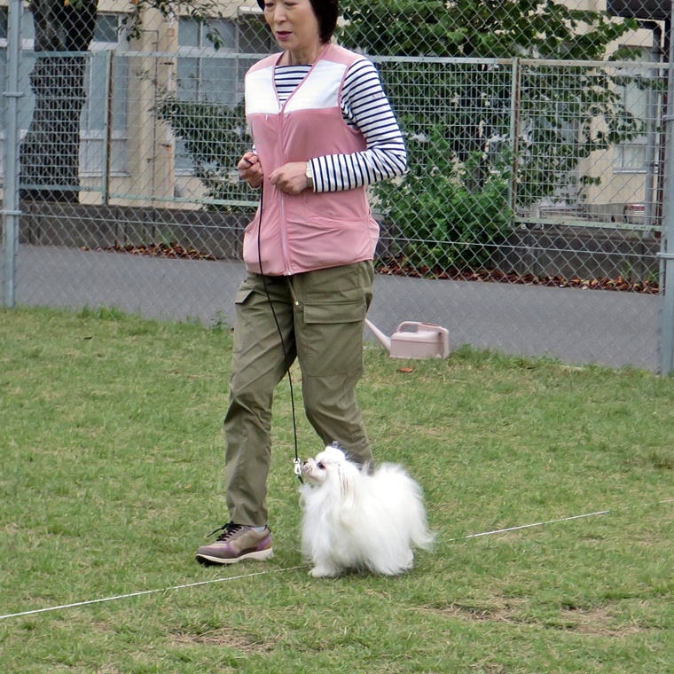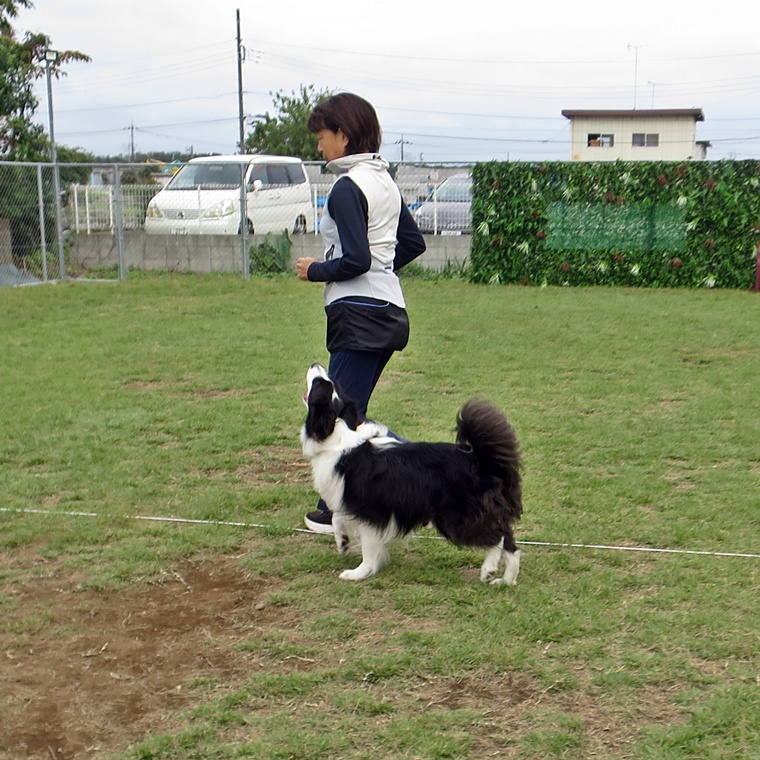 前回よりも脚側停座の「Heel」で指導手への意識が向くようになってきています。ただ、指導手からのコマンドの頻度が多いようですので、コマンドを多用しないで脚側行進の維持ができる事を目指していきましょう。紐なし脚側行進は、少し楽しくなり弾けていましたが、紐なしでも同調できるようにトレーニングをしていきましょう。伏臥の際の後肢の崩れは、丁寧に改善をしていく必要がります。立止は、非常に良くなってきています。伏臥の際の後肢の崩れは、脚側停座の姿勢の際に、既に崩れてしまっている為に、伏臥でも崩れることが考えられます。また行進中の伏臥では、伏臥の際の後肢のズレが習慣化しているようですのでもう一度、確認しながらトレーニングをしてみて下さい。自由選択課目もバリエーションを増やしてみて下さい。