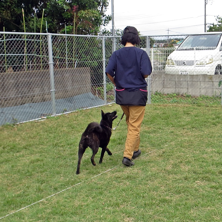 脚側行進の速歩の姿勢の維持に関しては、紐付き脚側行進での強化を進めると共に、コマンドへの正しい反応も引き出せるようにしていきましょう。また、指導手の歩度が、どうしてもレティちゃんに合わせがちになります。あまり速い速歩は必要ありませんが、一定のスピードを維持しつつもレティちゃんには合わせずに速歩をするようにして下さい。その場での伏臥と行進中の伏臥は、肘浮きが目立つ時期になりましたので、指導手のコマンドに対して好意的な気持ちで伏臥ができるようなトレーニングを取り入れていきましょう。自由選択課目で取り組んでいる物品持来の動きは少しずつ形になってきています。