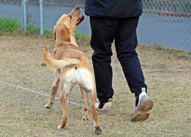 脚側行進の先行ポジションの修正は、指導手の歩度で対応し、歩度に対して同調した瞬間を誉めるようにして下さい。分割トレーニングでの停座の位置は、先行する傾向が、そのままポジションとして表れていますので、意識させるようにしましょう。行進中の作業も脚側行進の精度を高めることで更に完成度が高くなりますので焦らずに根気強く進めて下さい。
