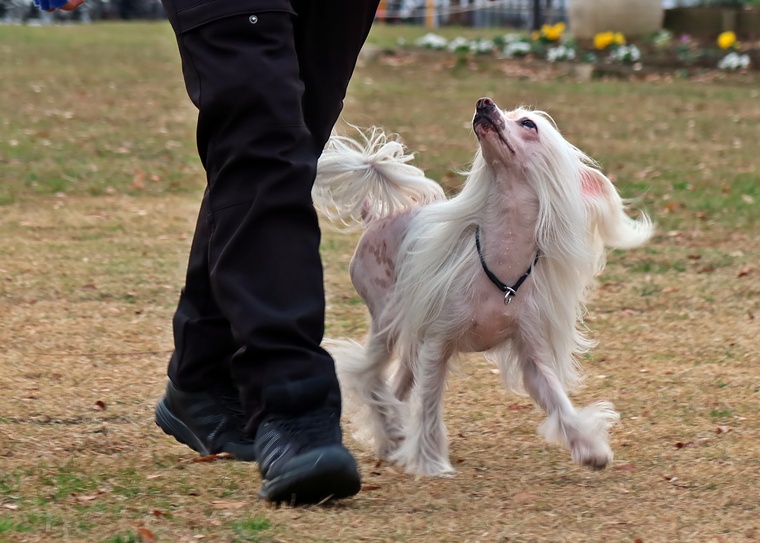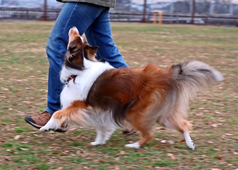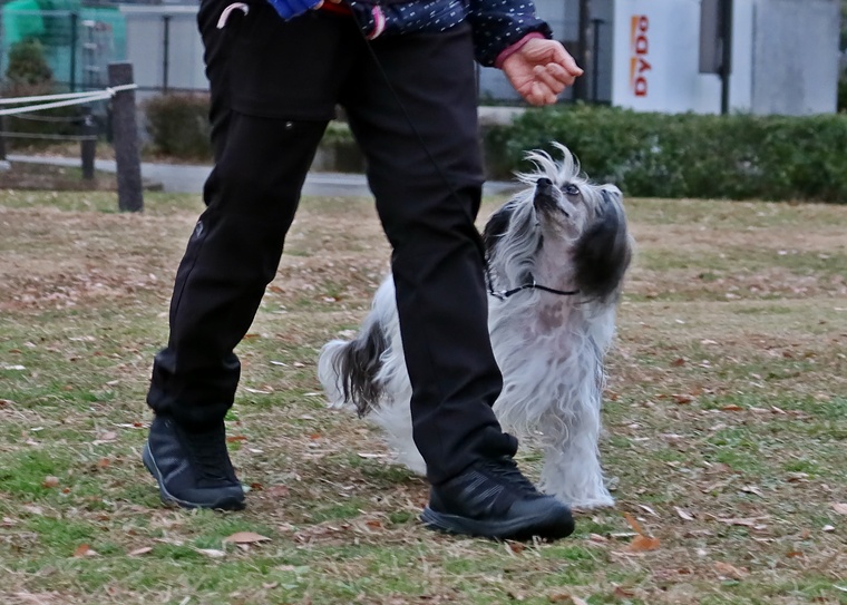 脚側停座と脚側行進の関連性を理解しながら、焦らずに姿勢の理解を深めていきましょう。指導手の意識がアーシャちゃんの動きに集中してしまうと、真っすぐに脚側行進できずにアーシャちゃん寄りに動いてしまいますので、真っすぐに脚側行進をする中での修正を考えていきましょう。切り返しの動きに関しても脚側停座に真っすぐに停座できる事を考えていきましょう。