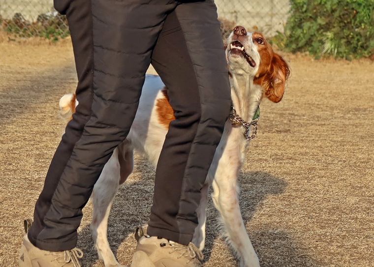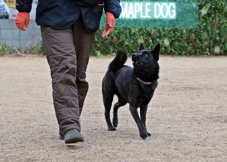 指導手との距離間は、紐なし脚側行進の際に極端に広がりますので同調性を高めていきましょう。左屈折の動きは、指導手の手の動きや体の使い方がトレーニングで意識させる為の動きと、本番の動きの違いを理解してトレーニングをしてください。脚側停座のポジションは、常に意識をして正しい位置を理解させてください。