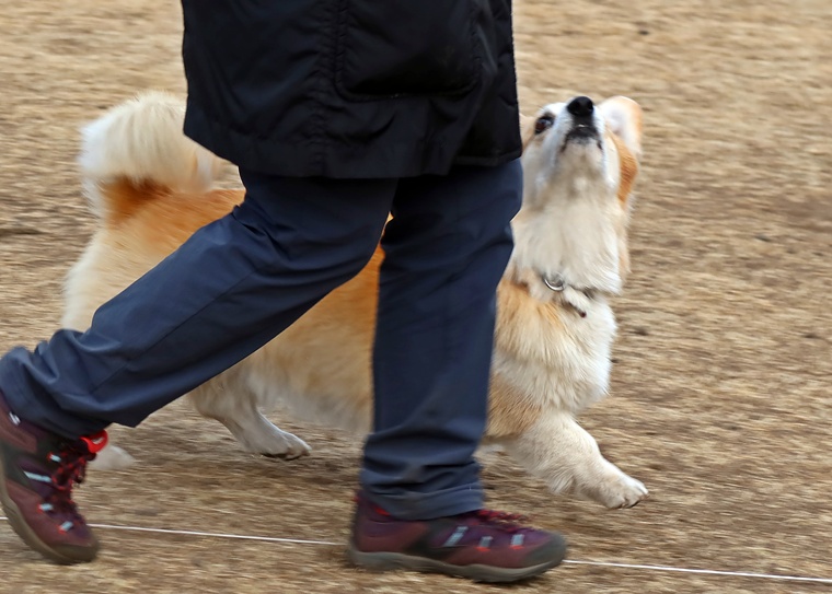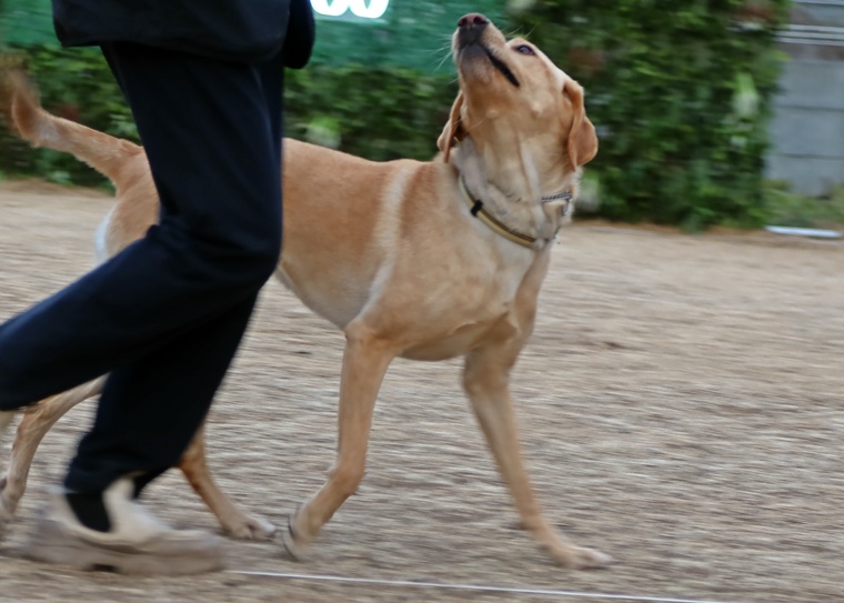 意欲と集中力は充分ですので、脚側行進は少し先行しますが、指導手が自信を持って脚側行進をする事が大切です。行進中の作業はコマンドへの反応速度が遅れますので集中力を高める事とともにコマンドを出すタイミングを工夫していきましょう。