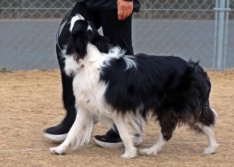 いつもよりも脚側行進のスタートから集中が維持できない状態が見られましたが、課目終了時の脚側停座は、いつも安定していますので今後も維持してください。また右屈折の膨らみも少し改善されてきています。行進中の作業は、集中力の低下から反応速度が緩慢になっていますので、スタートのスイッチをシッカリ入れられるようにしていきましょう。