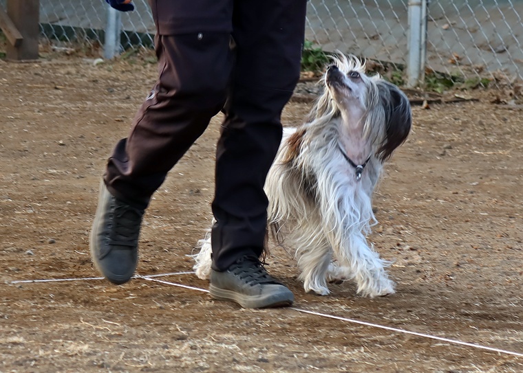 指導手の歩度を一定に保つ事や、指導手の姿勢を維持する事など、いくつかのステップアップの要素が出てきていますので、アーシャちゃんの集中を維持しながらステップアップへの適応を観察していきましょう。脚側停座の精度も、指導手の姿勢が影響していますので意識してみて下さい。