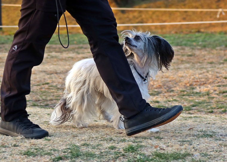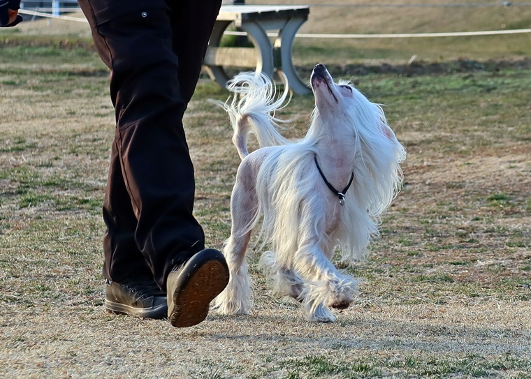 紐付き脚側行進の指導手への意識が安定してきていますが、最初の屈折への意識づけを更に強化して、どちらに屈折をしても同調性が乱れないように取り組んでいきましょう。紐なし脚側行進では、更に動きに差が出てきますが、遅れる事はありませんので精度を高めていきましょう。招呼の際の停座での静止時間も長めに設定して指示前に動かないようにトレーニングをしていきましょう。