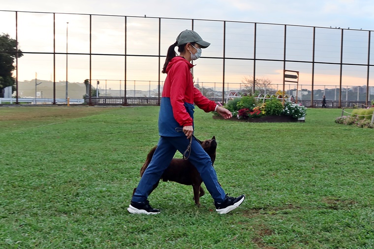 トナ君は、脚側停座の集中姿勢も安定していましたので脚側行進のコマンドへの反応も素早くなり脚側行進自体も安定してきました。復路へのターンも前回よりもタイトにターンができていますが、まだ改善の余地はありますので取り組んで下さい。左屈折の同調性が、今後のトレーニングの1つの課題です。脚側行進が先行してしまうと、左屈折をスムーズに屈折できませんので現在よりも同調性を高めるようにして下さい。また課目終了時の脚側停座は、まだ正しい位置に停座できませんので落ち着いて停座できるようにしていきましょう。紐付き立止に関しては、前回よりも改善できてきています。