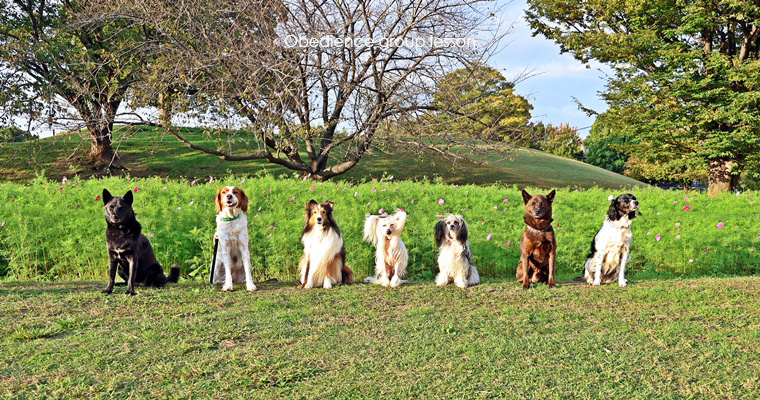 今朝のオビディエンスグループレッスンに参加されたのは、モモちゃん&レティーちゃん・たんぽぽちゃん・ローキーちゃん・ブルース君&リンゴスターちゃんの4組6頭です。