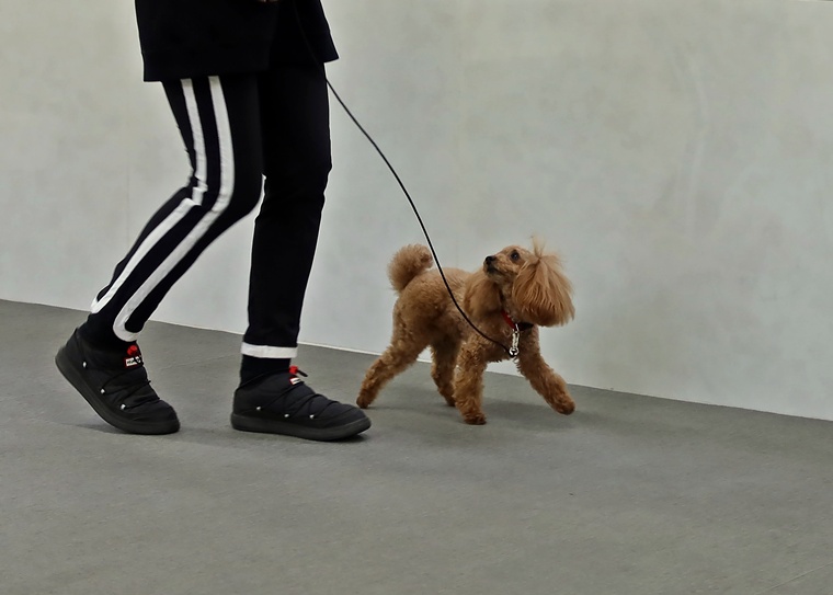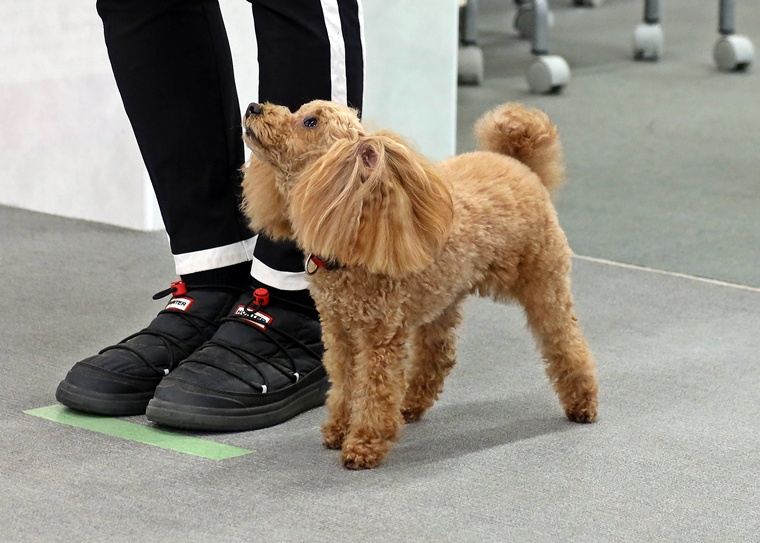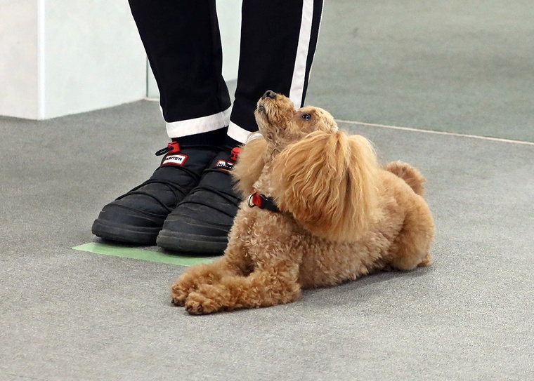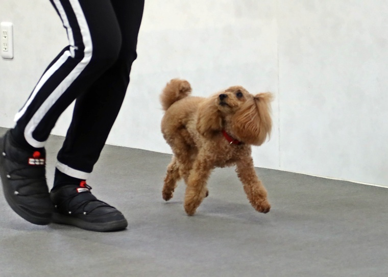 指導手との距離間の修正が思うように進んでいませんが、日々のトレーニングを考えると指導手がエンジェルちゃんの進む方向に合わせてしまう傾向が見られるようです。直線を意識して脚側行進のトレーニングをしていきましょう。特に紐なし脚側行進に関しては、前後のズレも出てきますので、視符を効率よく活用して脚側行進のポジションの理解を進めていきましょう。課目終了時の脚側停座も、脚側行進の際の指導手との距離間をそのままの状態でターンしますので、脚側停座の位置が斜め前方で停座してしまう結果になります。トレーニングでは、この停座位置を正しい位置に戻して報酬を与えるパターンになっていますので、1度で正しい位置に停座する理解にはならず、停座をやり直すことの理解につながっています。公開訓練試験では修正自体は重大減点とはなりませんが、今後の競技会へのステップアップを考えた場合は「一度で正確に完了する完成度」が今後の課題となります。