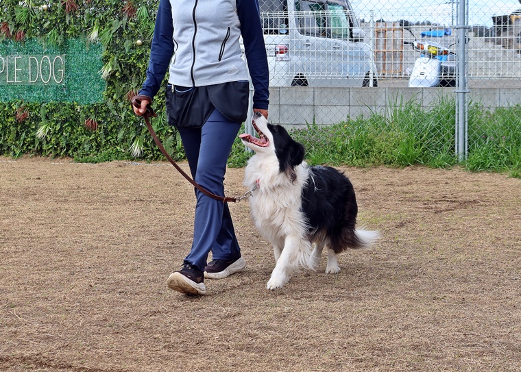 刺激が沢山ある、ランの中では飼い主さんのコマンドを優先するよりも自分の興味が優先してしまう段階です。しかし、飼い主さんは妥協せず諦めず根気強く呼び戻しのコマンドを出し続けることで、飼い主さんが距離を縮めるのではなくアメリちゃんが戻る事を繰り返し実践させます。本来であれば、ロングリードで範囲を決めて確実に戻す事がトレーニングとしてのセオリーですが、アメリちゃんの自主性にフォーカスしたトレーニングとして行なっていますので飼い主さんの根気が必要となります。