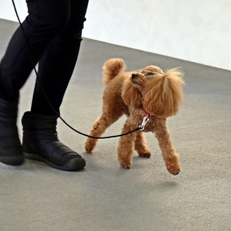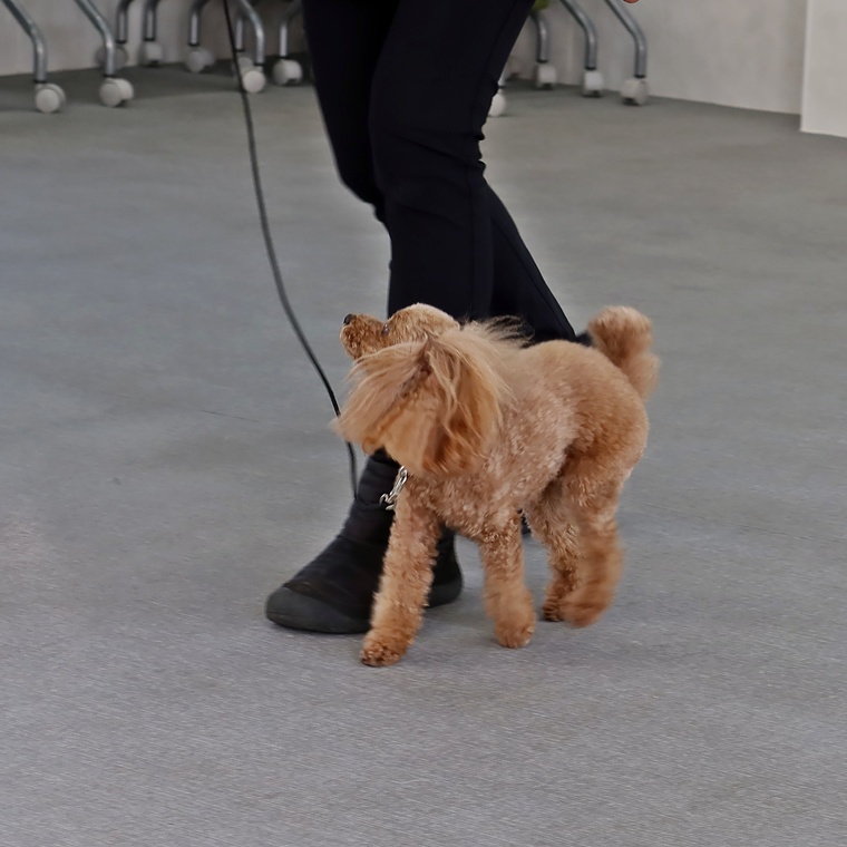 紐付き脚側行進での安定した動きをつくる事で紐なし脚側行進へのステップがスムーズに進むことができます。現時点のトレーニング方法では、指導手の体の動かし方やトリーツの与えるタイミングなどに習慣化された動きがありますので、エンジェルちゃんに規定の動きを理解させる為には、まず指導手の基本姿勢の理解を進めながら、トレーニングの段階で、どこまで指導手の姿勢がズレているのか?を客観的に意識しながら進めていきましょう。