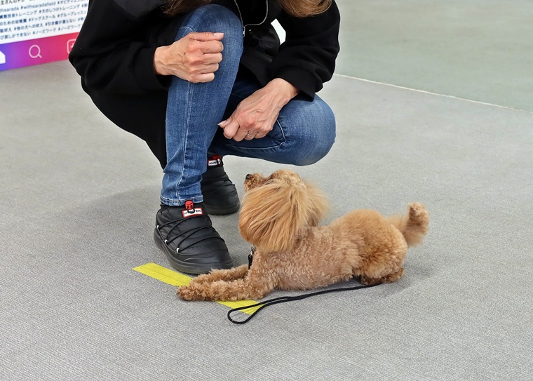 基礎トレーニングからステップアップしていきますが、反応速度の基準を一貫し、例外を作らない事が必要です。全ては、「素早く伏せる」が答えですので、過度なトレーニングでミスを切り返さない程度で終わる事がトレーニングを成功させるコツでもあります。また誘導→視符→声符のステップを繰り返すことでエンジェルちゃんの理解も深まります。