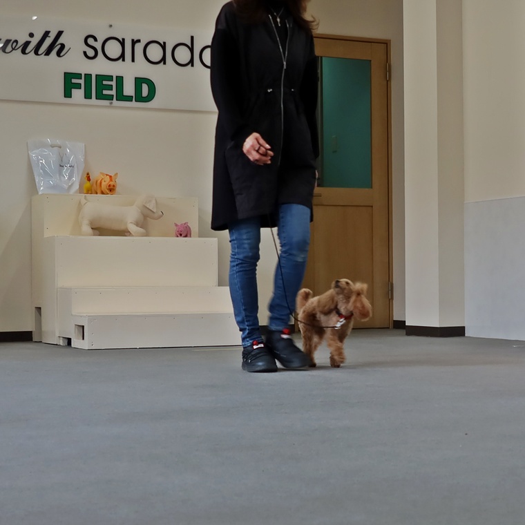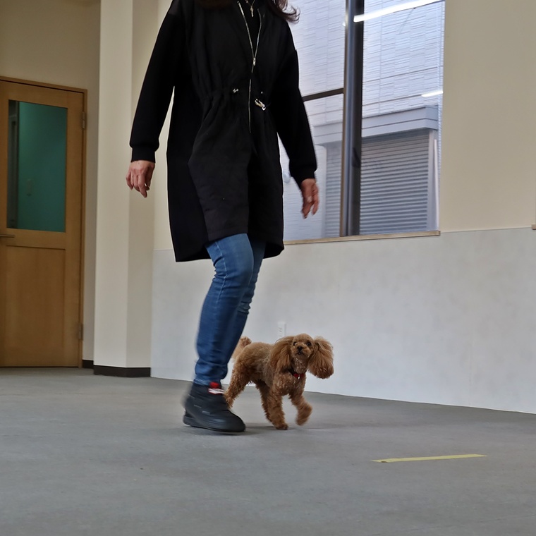 紐付きと紐無しに差ができないようにトレーニングをしていきましょう。特に紐なしは、指導手がエンジェルちゃんに寄りながら距離を縮める傾向がありますので、エンジェルちゃんと離れるような方向性で脚側行進を行いながら、エンジェルちゃんから指導手に寄る反応を見せたタイミングをシッカリ誉めて強化してください。