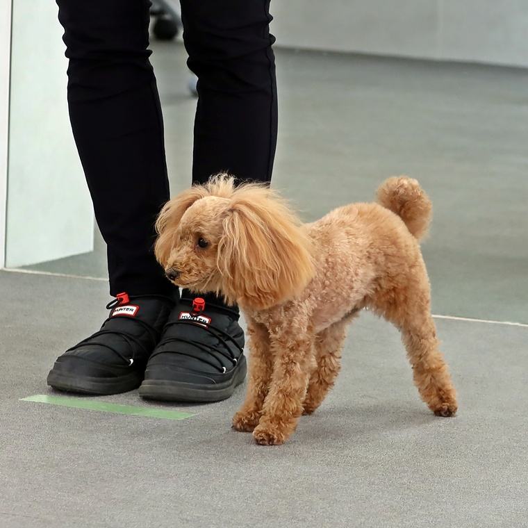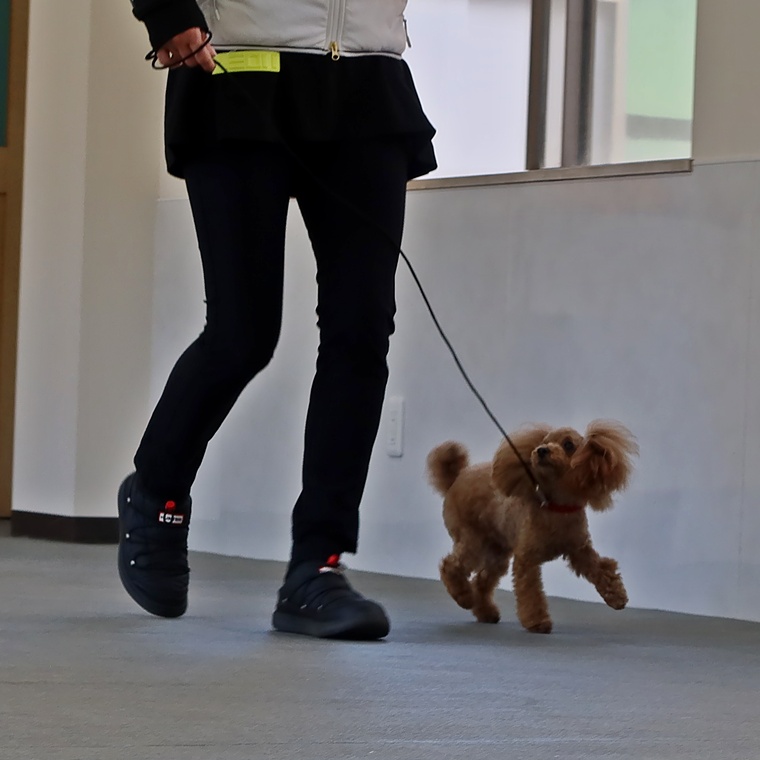 以前から課題になっている脚側行進の指導手との距離間について、直線では、同調性のある時間帯もありますが、屈折とターンを伴う事で距離間が開いてしまう傾向が見られます。日頃のトレーニングでも離れている状況で傍に戻す為にトリーツで誘導するのではなく、視符などで同調を促し、エンジェルちゃんが同調して脚側行進を維持出来たら報酬を与えられるようにしていきましょう。