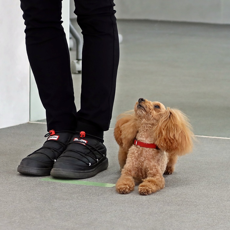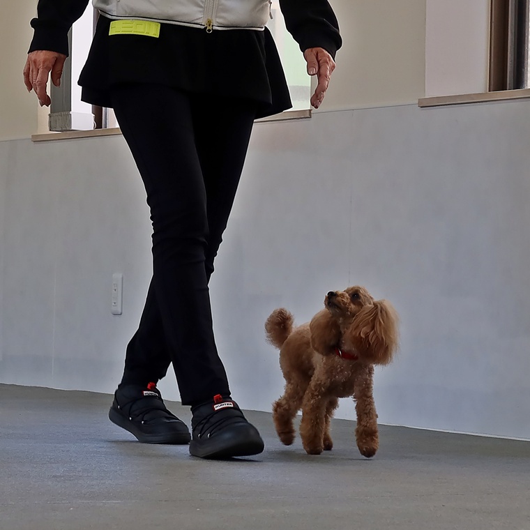 前回のレッスンで行った伏臥の反応速度の強化を繰り返しトレーニングをしたことで、立止や停座とのバランスが崩れているようです。行進中の伏臥は、伏臥への反応速度も強化ポイントですが、まずはシッカリと集中した脚側行進ができる事を目指していきましょう。その場での立止も、実行性が不安定になっていますので、バランスの良いトレーニングをしていきましょう。