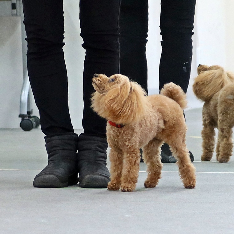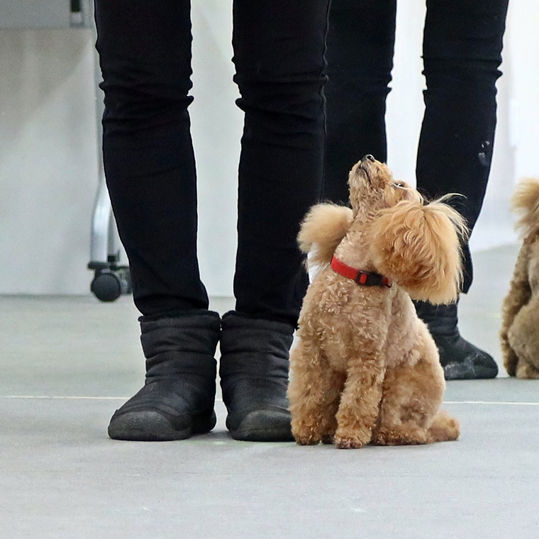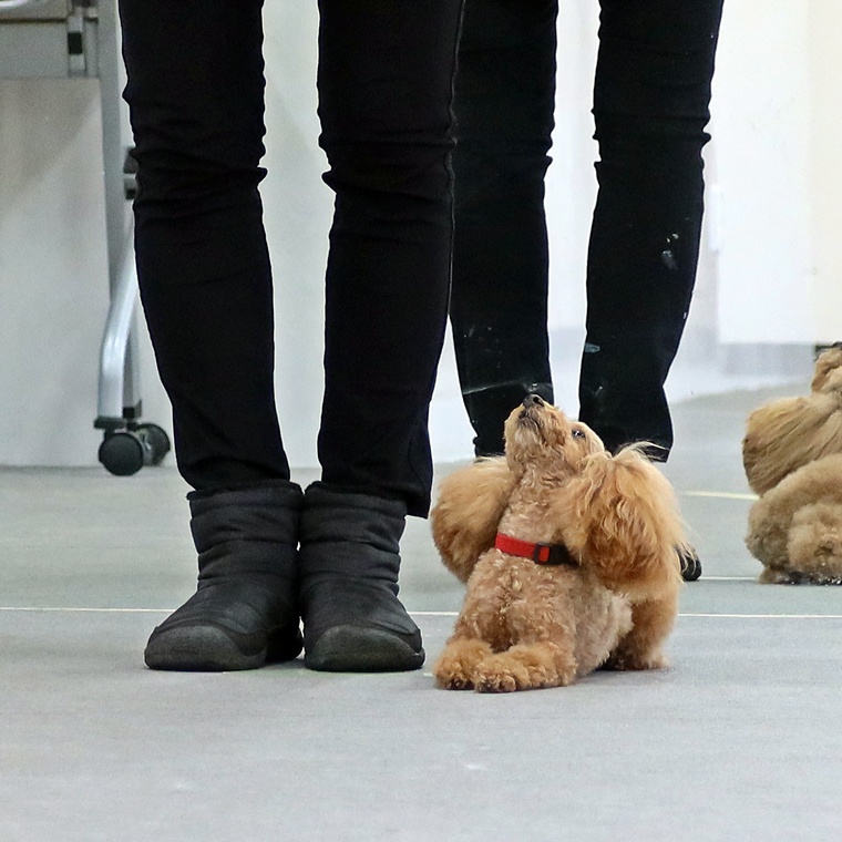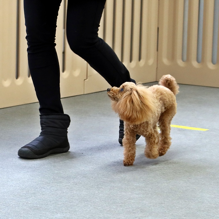 脚側行進は、前回の屋外でのレッスンの方が同調性がありました。今日の脚側行進は、指導手との距離間が目立ちましたので、また次回のレッスンで調整していきましょう。課目終了時の脚側停座に関しては、指示を出すタイミングを焦らないようにして下さい。行進中の作業に関しては、指示をシッカリ出して確実に実行させましょう。