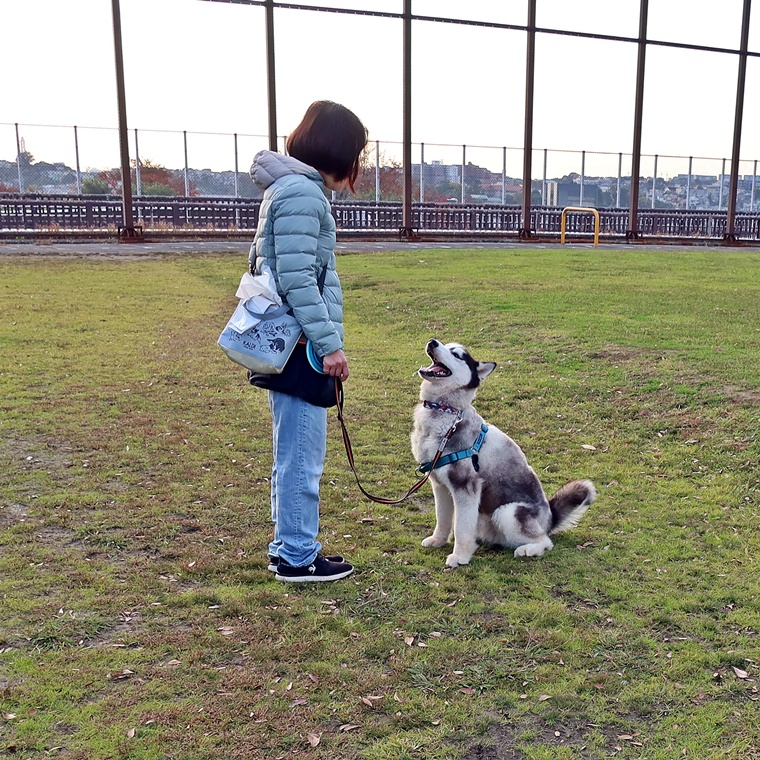 今朝のアシュレイ君のレッスンは、現状の確認とコマンドの基礎トレーニングを行いました。アシュレイ君にとって最高の季節を迎えていますので、充分なエネルギーの発散が必要になります。飼い主さんも、試行錯誤しながら努力を重ねているようですので、まずは楽しく遊びながら基本的なコマンドの実行性を高めるようにしていきましょう。