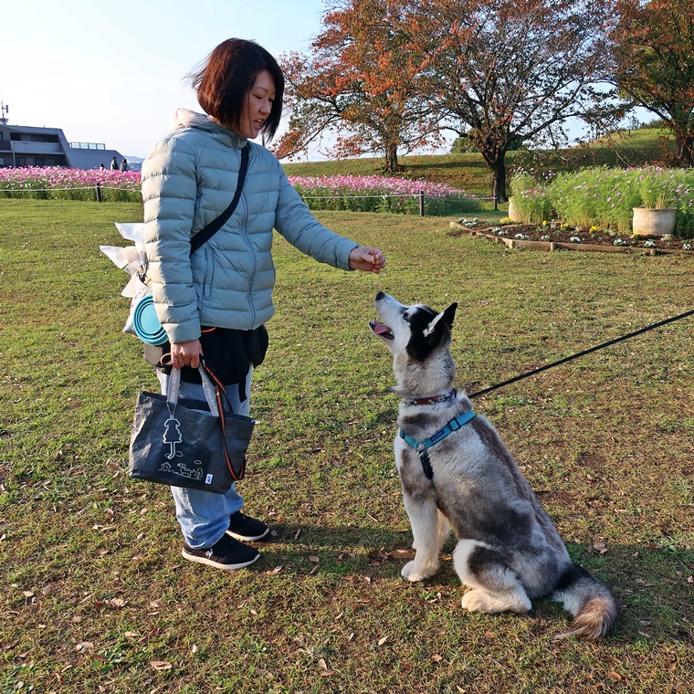 このトレーニングも、コマンドや誉めるタイミングなどが大切ですので、あまり言葉を連呼せずに誉めるポイントを飼い主さんが理解した上で取り組んで下さい。「人の前へ行ったらお座り」の関連付けを強化していきましょう。
