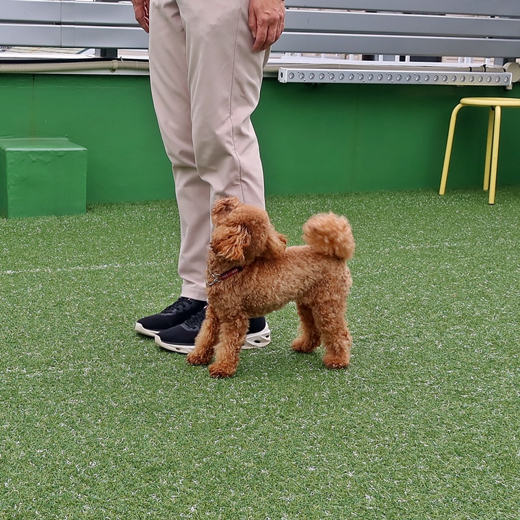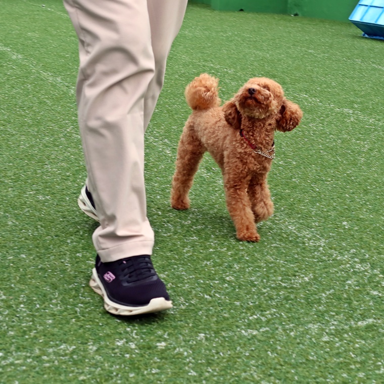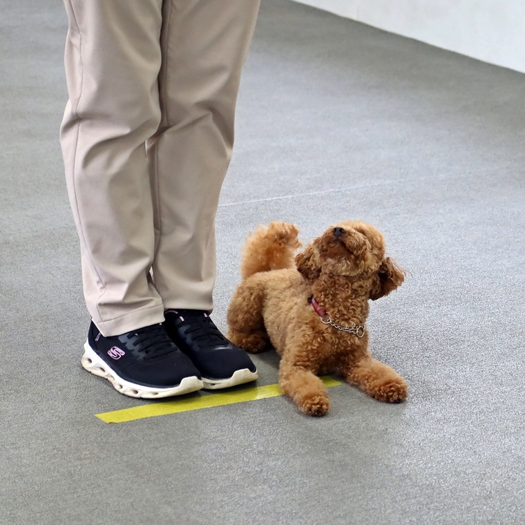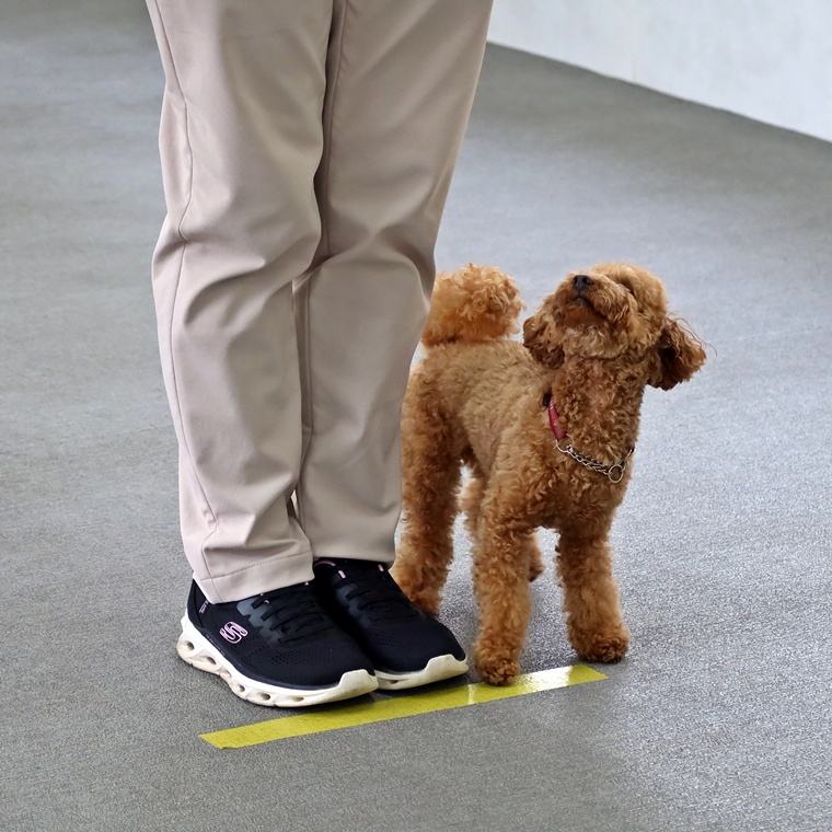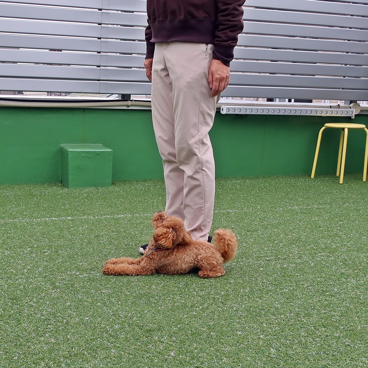 FIELDでは、ヒールポジションへの集中と姿勢の維持が出来ていますので、「伏せ」と「Stand」のコマンドへの報酬だけに留めるようにして1つ1つのコマンドへの理解と確認をしていきましょう。またこの際に、飼い主さんの視線はコマンドを出す瞬間だけcocoちゃんを見るようにして、視線を送り続けずに注意をしてください。