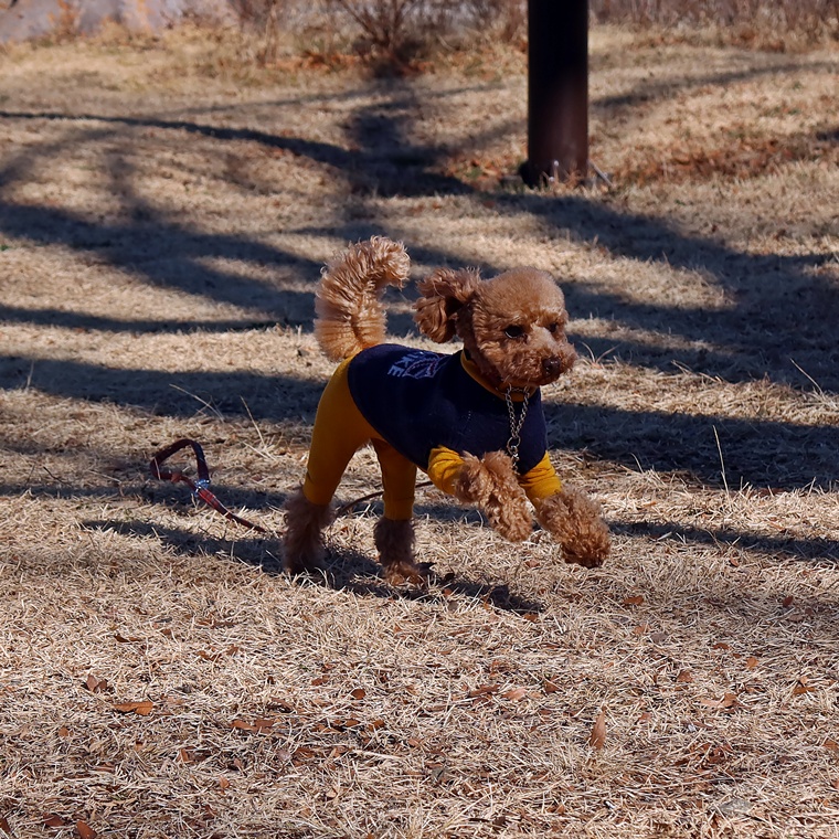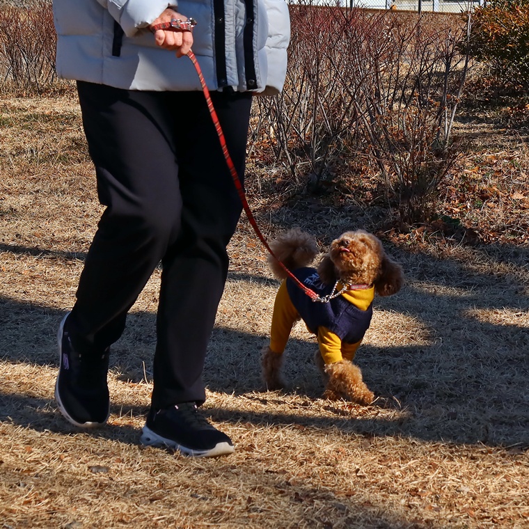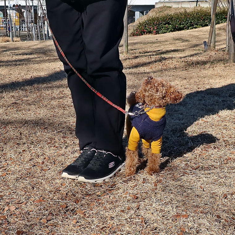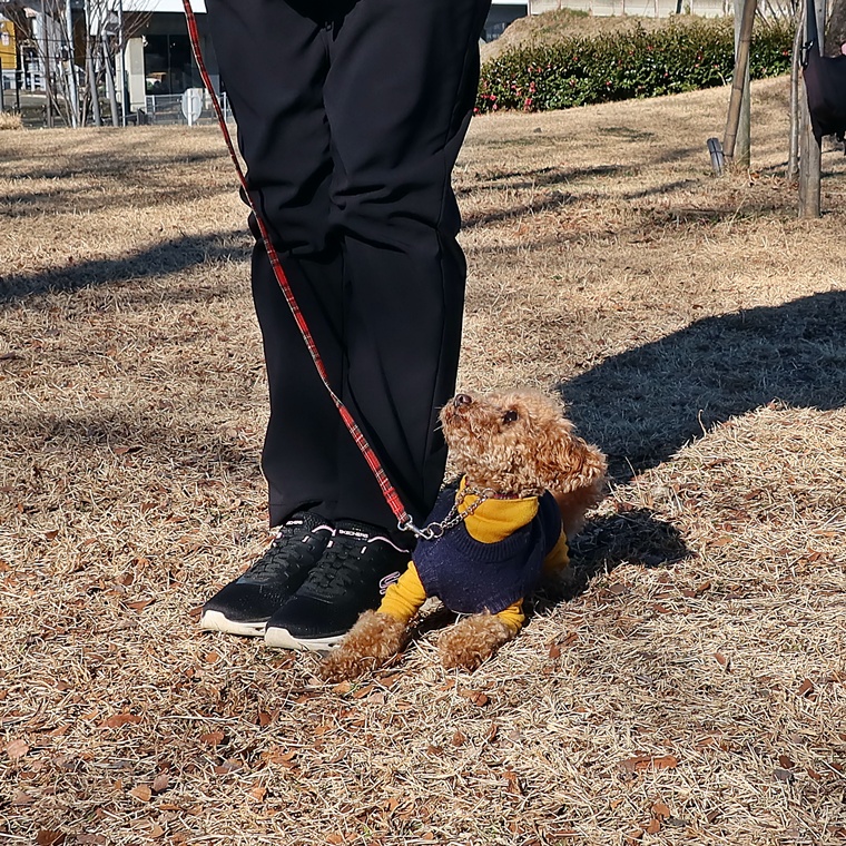 「ヒール」のコマンドでヒールポジションへ移動する反応は、屋内での反応と遜色ない動きでした。気温の低い日が続いていますので、cocoちゃんにはとても厳しい環境下でしたが「伏せ」の姿勢も頑張って維持が出来ています。まだ立止のコマンドとの先読みが出やすい状況ですが、この要因は飼い主さんからの報酬のタイミングです。前回のレッスンでも、この点についてのアドバイスをさせて頂きましたが、無意識に与えてしまうタイミングがありますので注意していきましょう。