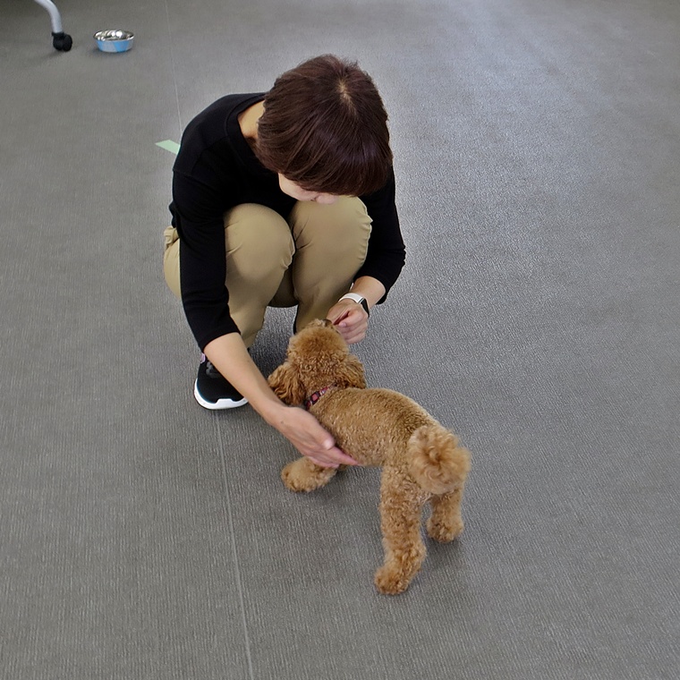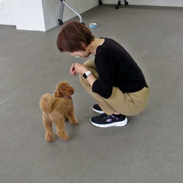 現時点では、トリーツを持つ手を追いかけたり飛びついたりする事で、トリーツを得ることを学んでいるcocoちゃんですので、今後のステップで大切なアイコンタクトについて強化をするトレーニングを行いました。