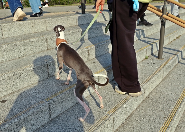 楽しく意欲的に「ヒール」のコマンドに対して反応できています。飼い主さんの誉めるタイミングをステップアップして、あまりトリーツに頼らずにヒールでの歩行の維持ができるようにしていきましょう。階段なども、飼い主さんと歩調を合わせて下りたり上ったりできるようにする事は、今後の成長にもつながります。