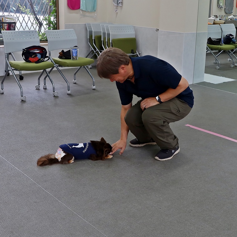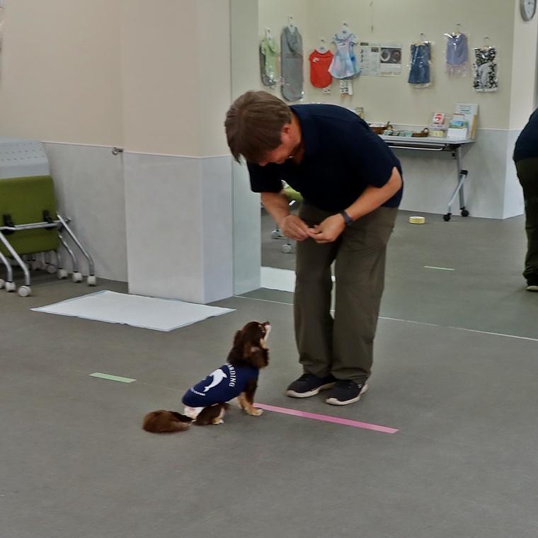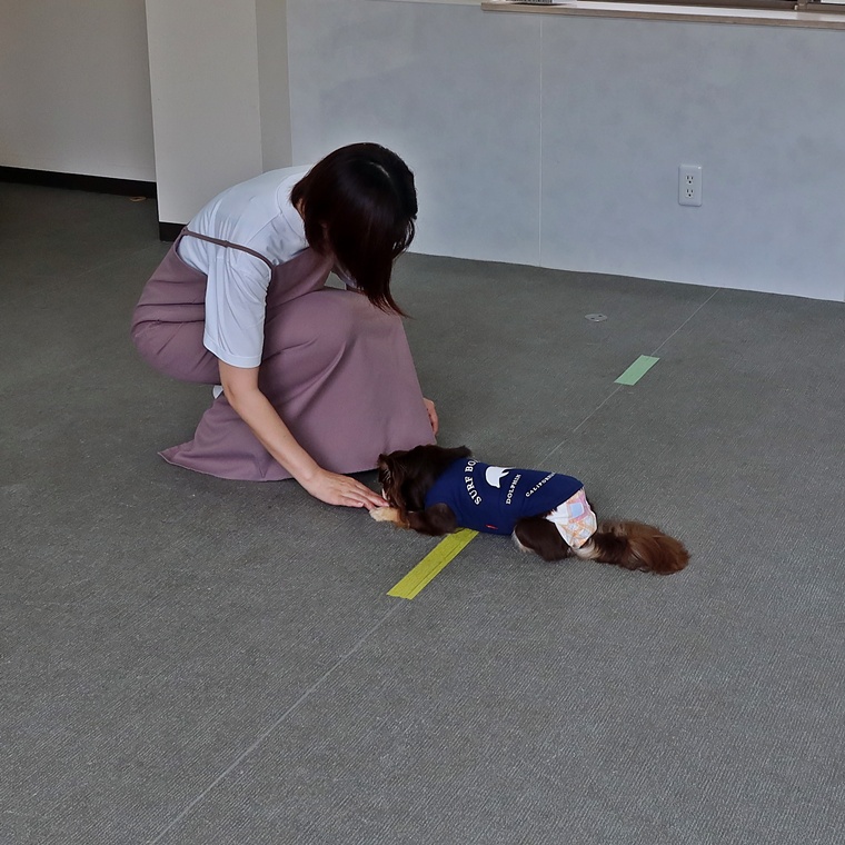 今日は、新たに「伏せ」のコマンドの導入トレーニングを行いました。今までに経験のないコマンドですので、最初の導入時は、ルアートレーニングで伏せの姿勢へ誘導してトレーニングを組み立てます。