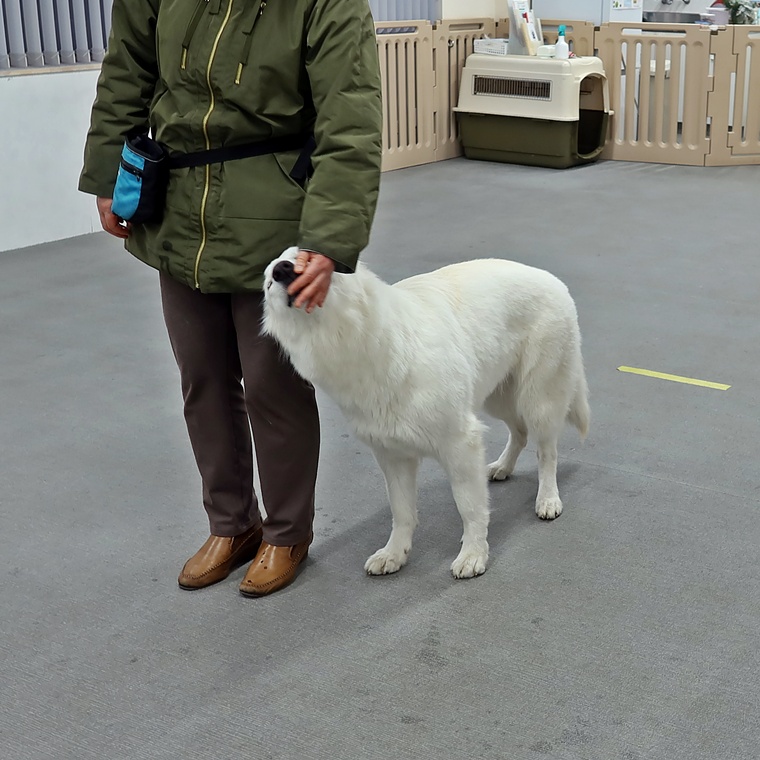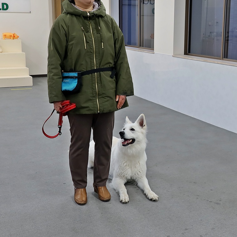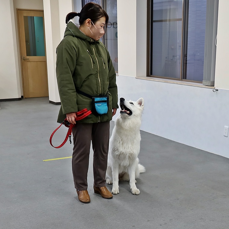 まず、飼い主さんが正し位置に誘導できるスキルを身につけていきましょう。前回のレッスンで行った「立止」のコマンドは、飼い主さんの誘導の仕方の誤解があった事で、春凪ちゃんがスムーズに立つことができなかったようです。今日な、ヒールポジションの位置で立止もできましたので、「Heel」の脚側停座のポジションの精度を高めて「伏せ」と「立って」のコマンドも声符のみでできるようにトレーニングをしてみましょう。