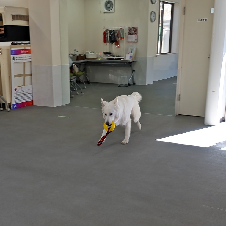 以前よりも飼い主さんの春凪ちゃんと「遊ぶ」という認識は高まっているようですが、もう少し引っ張りっこを楽しく取り入れながらレトリーブの動きを安定させていきましょう。今までの遊びの中には、「ピーピー」と音をさせるアイテムが多く、春凪ちゃんが喜ぶからと、時には与えっぱなしで遊ばせる機会も多かったようですので、引っ張りっこに特化したアイテムで遊べるようにしていくと、レトリーブも安定します。