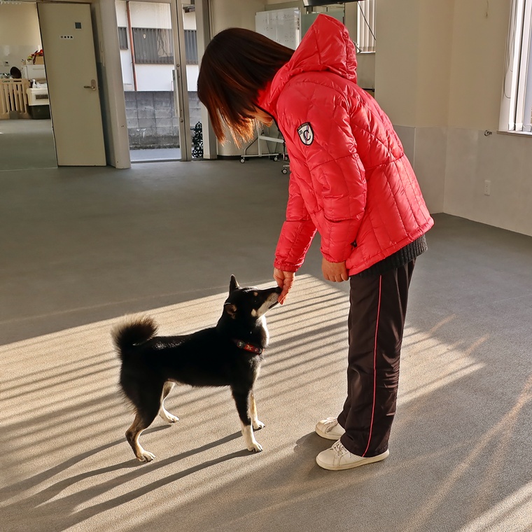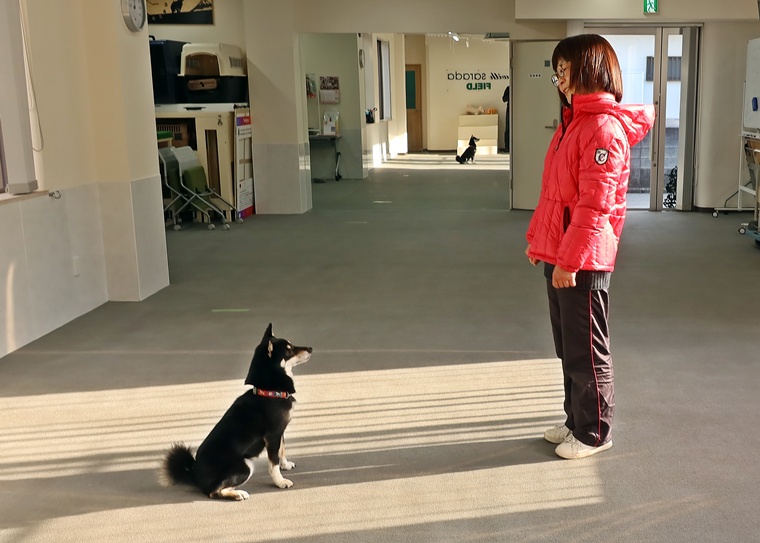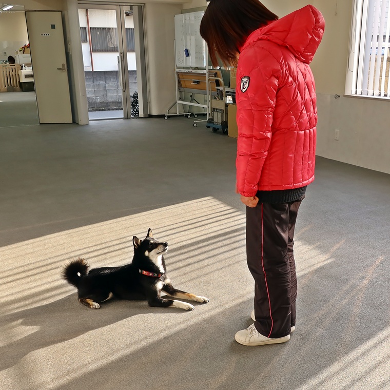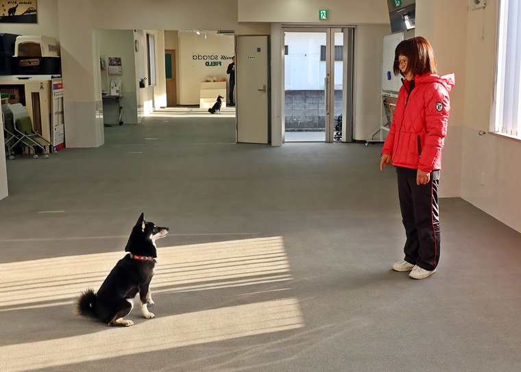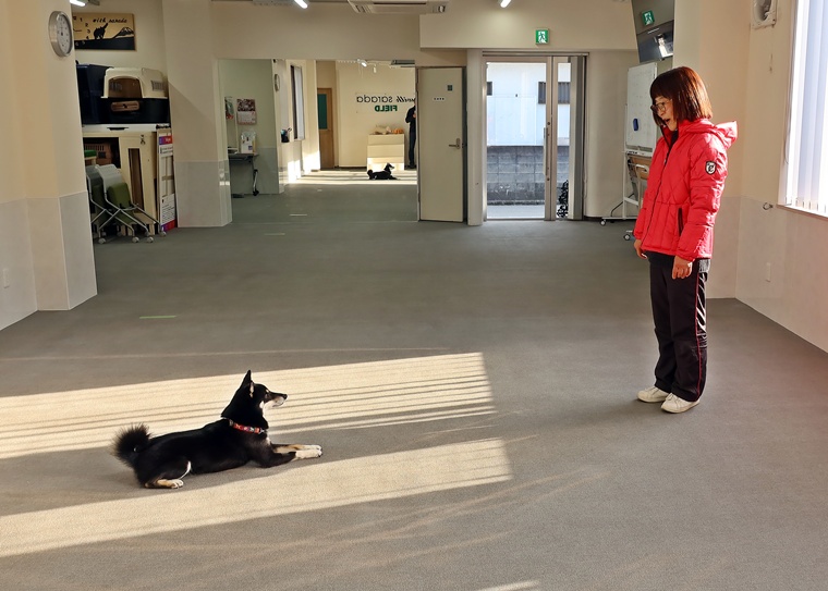 今までに経験がないこともあるコマンドですので、飼い主さんからのコマンドの意味が分からず、今まで通り「呼び戻し」と理解して、飼い主さんの元へ戻ってくる行動がみられましたが、距離を縮めて遠隔の基礎トレーニングを行う事で理解が進んできました。