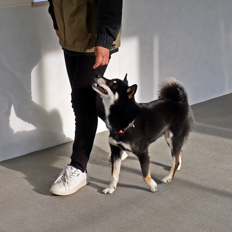 遠隔のコマンドだけではなく、ヒールポジションからの「立止」も同様の動きが必要になります。今回のように係留した状態の方が、無駄な動きが無くなり、後肢での立止の意識ができてきますので、同じようにトレーニングをしてみましょう。このトレーニングでは、最初のステップのトリーツでの誘導の際には、トリーツの高さを調整してはる君の意識が「お座り」の方向にならないように注意してトレーニングをしてください。