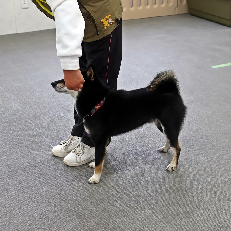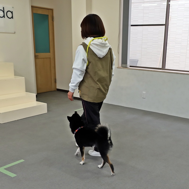 今日のレッスンでの課題は、飼い主さんの視線の向きです。飼い主さんが、はる君のポジションが心配ではる君を見続けると必然的にはる君のポジションは後方に下がり気味になります。少し自信を持って視線を後方に送らずに歩けるようなると、はる君のポジションは、理想的なポジションになりますので、日頃のお散歩の一部分に取り入れてみて下さい。