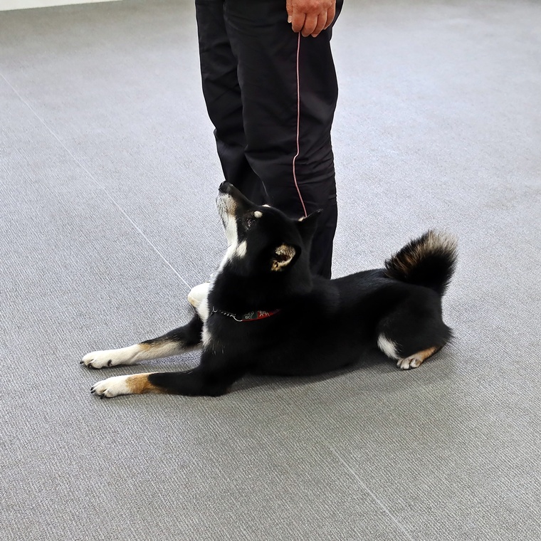 「伏せ」はとてもスムーズに実行できています。視線も飼い主さんに集中していますので、伏せの姿勢からヒールへの戻りも素早く戻れています。